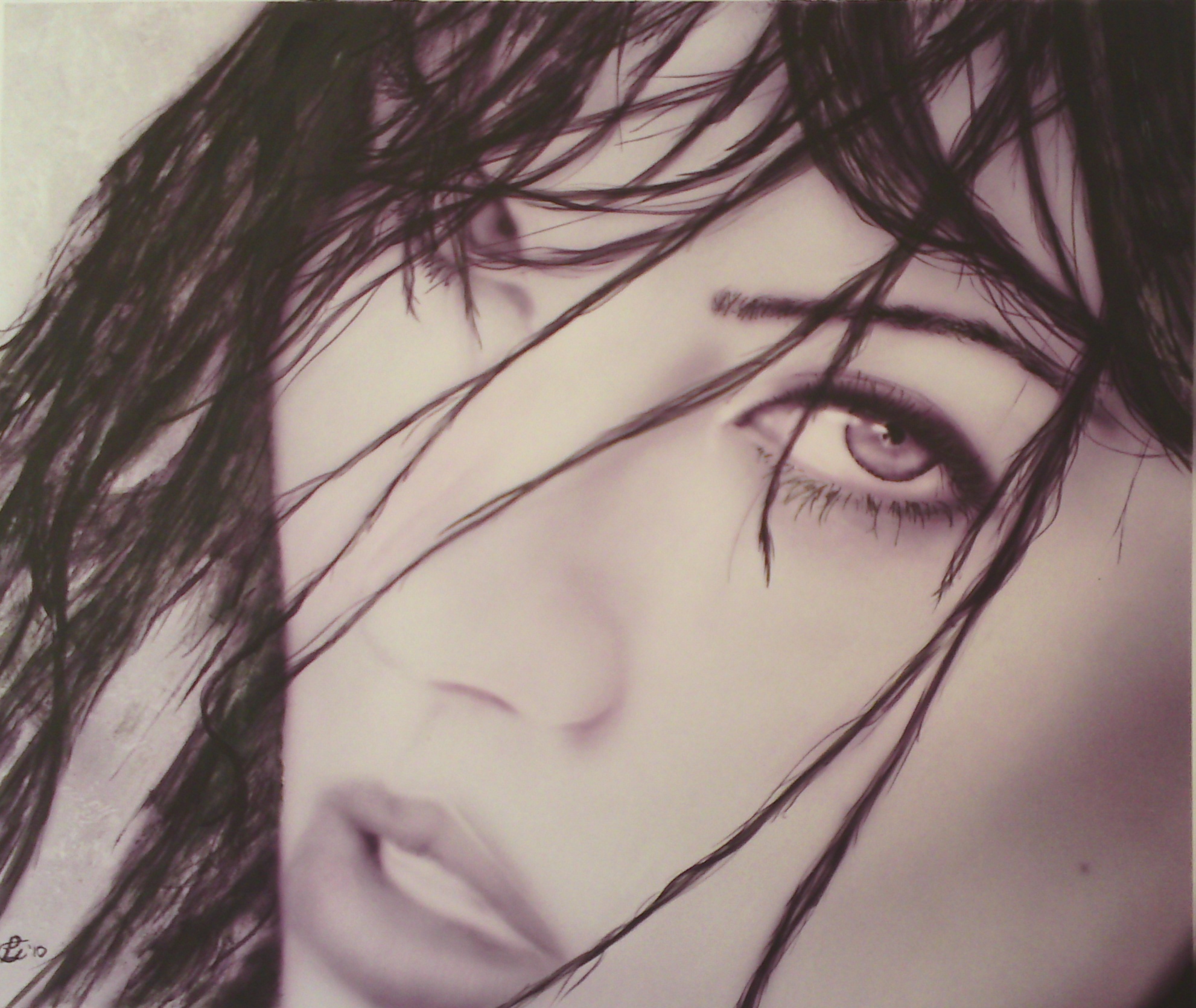 Wet, de zachte structuur van een vrouwengezicht naast de grove structuur van nat haar. Het paneel is Illustratieboard.