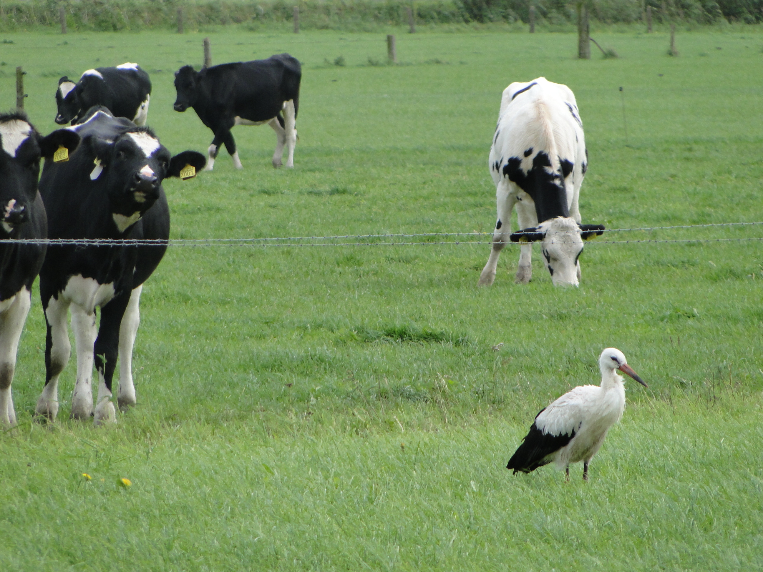 Kalf en ooievaar, samen in de wei.