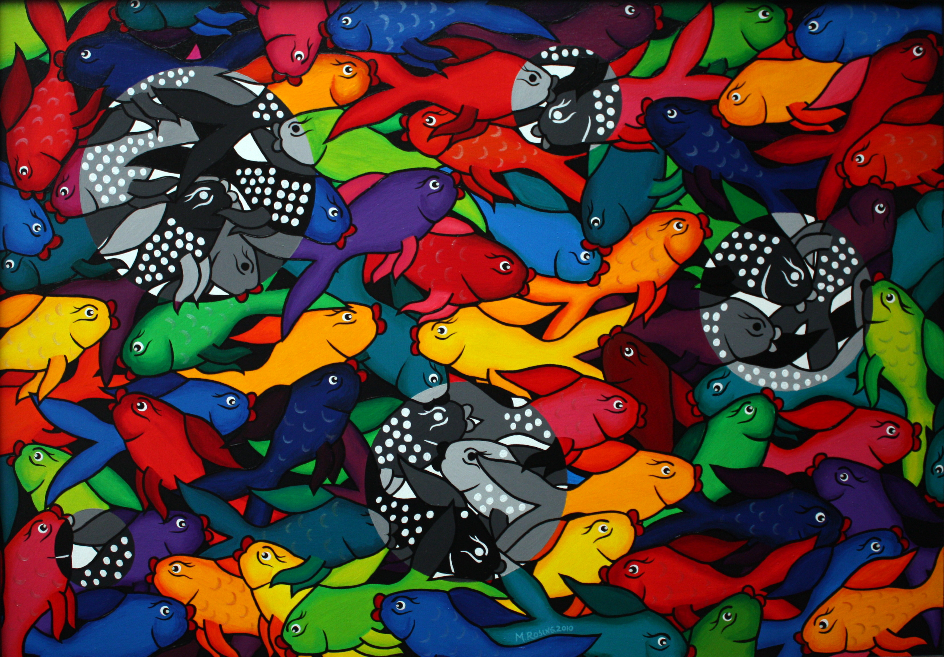 Wit Rood Geel Zwart Blauw Acryl Yellow Paars Groen Dieren Vis Kleurrijk Red Green Stippen Roze Purple White Compositie Kleur Vissen Pink Marieke Overlapping To