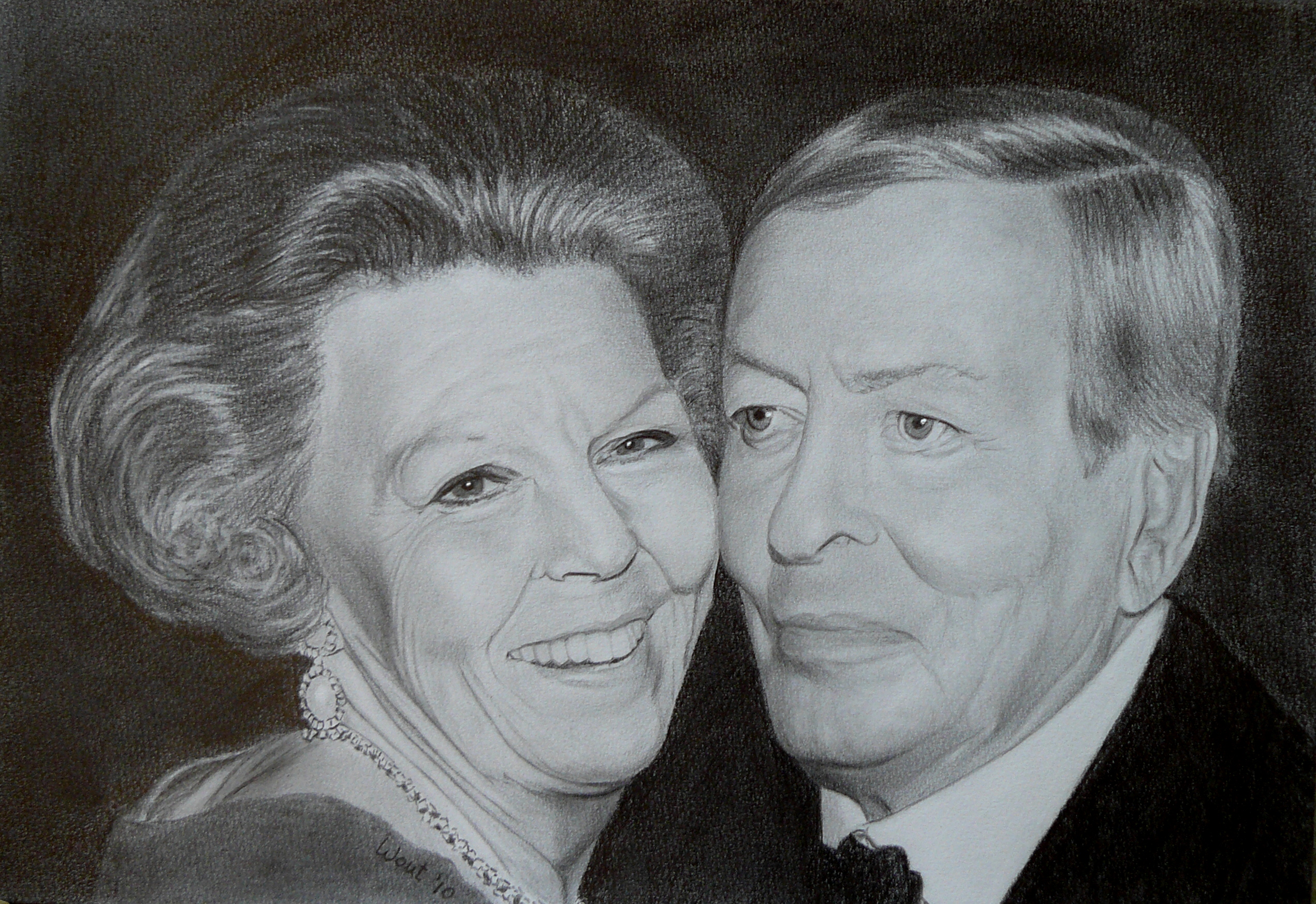 Portret van (toen nog) koningin Beatrix en prins Claus aan de hand van een foto uit 1998.
