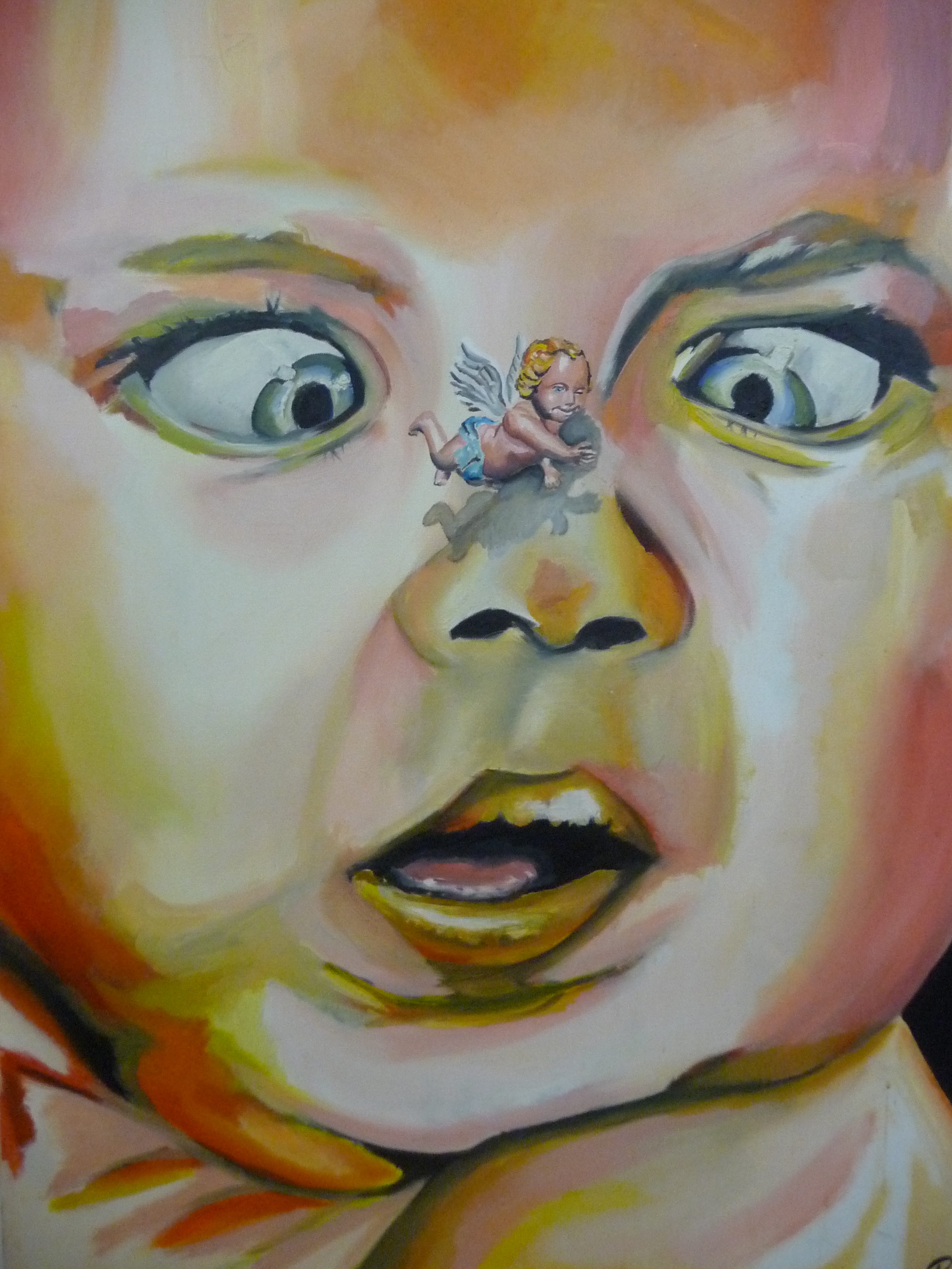 Een baby met op de neus een klein Cupido figuur realistisch geschilderd.