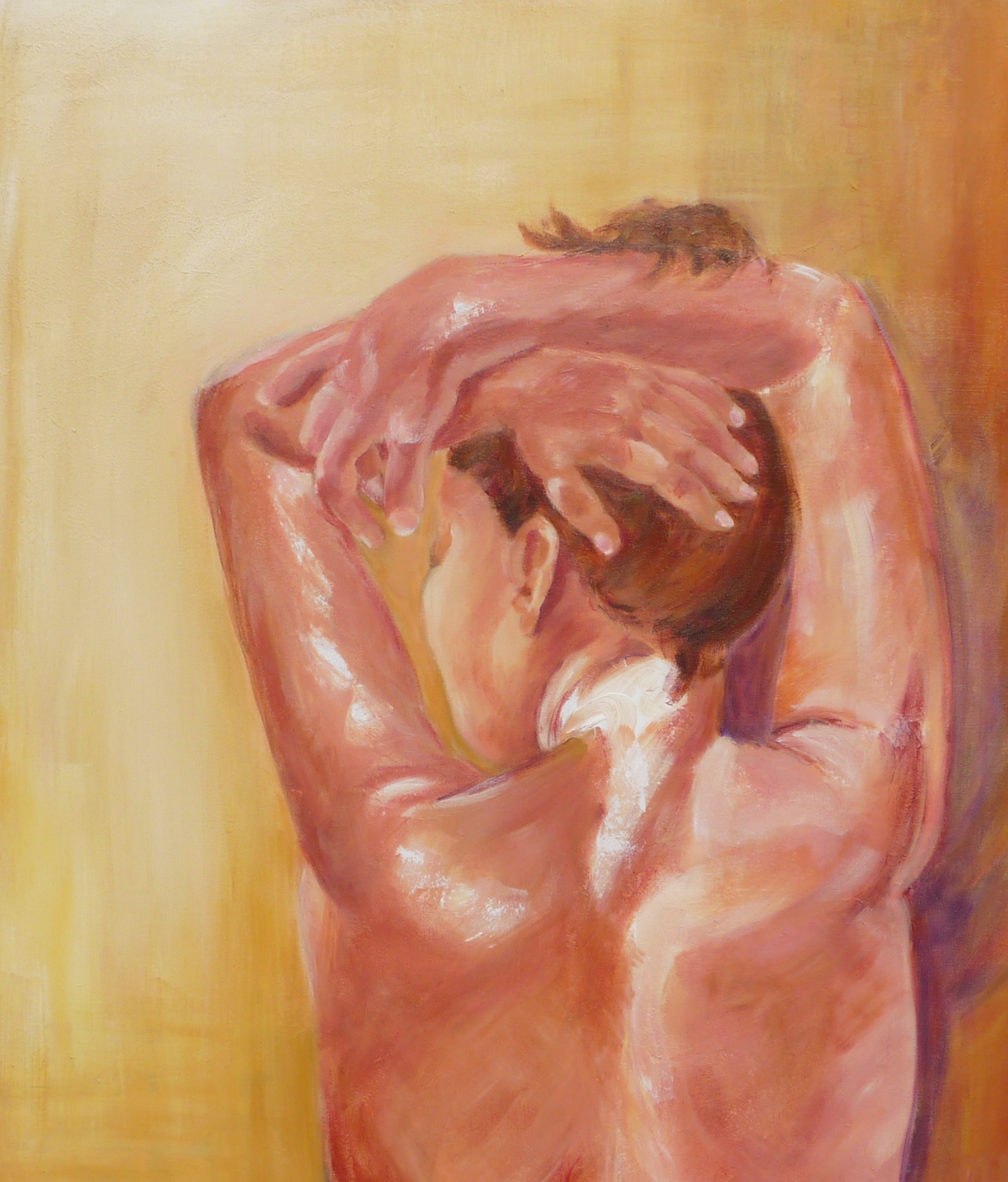 Een jonge naakte vrouw vanaf de rugzijde gezien. De eerder gemaakte aquarel is nu als uitgangspunt genomen. Ik heb geprobeerd om mijn perfectionisme los te laten en lekker zwierig te schilderen.