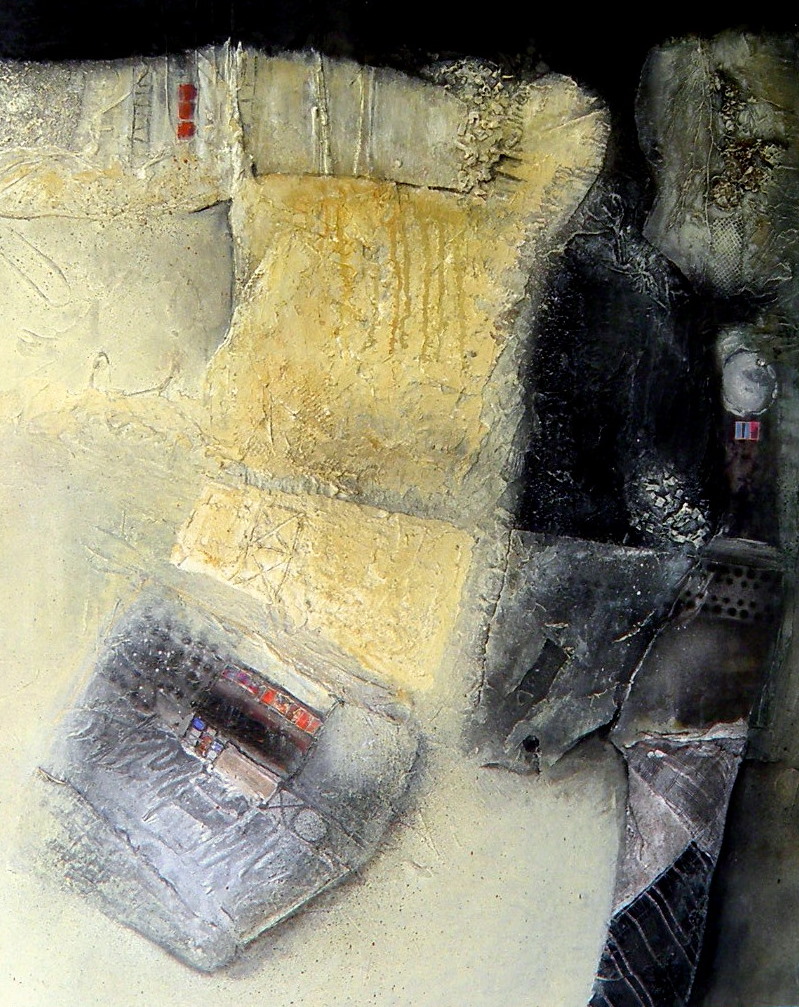 Landschappelijke vormen . Gemengde techniek,zand,papier,tegelcement ,acryl.