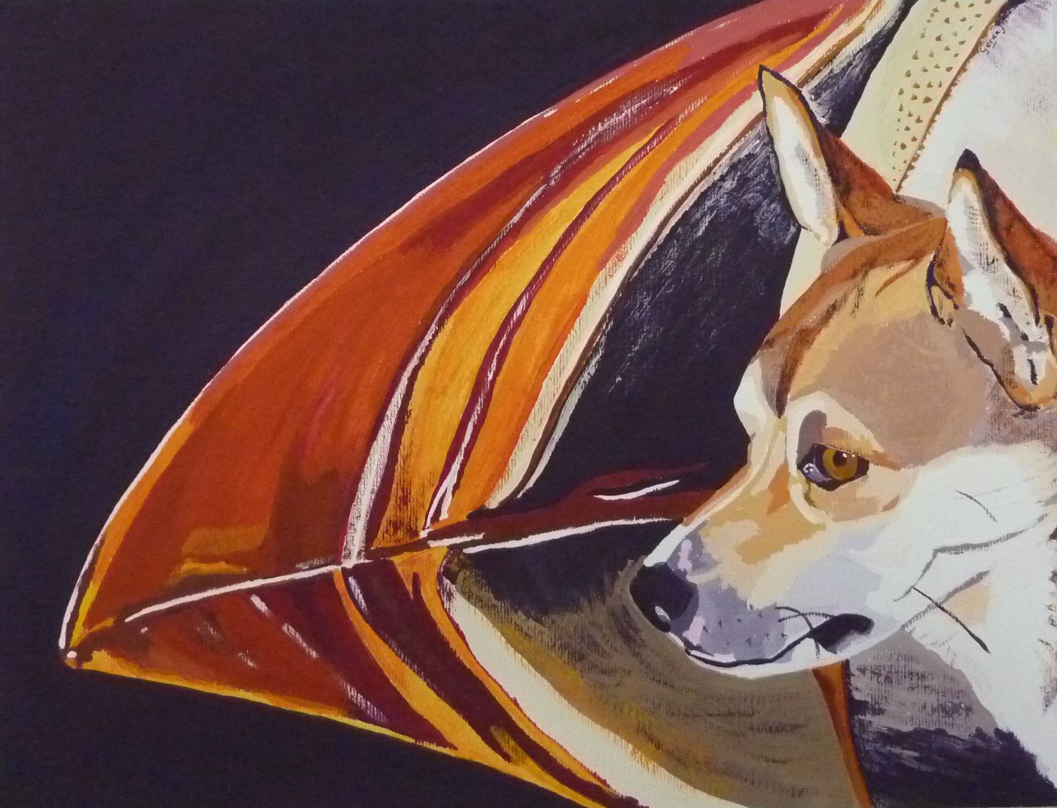 Oorspronkelijk jaagde de lundehund op de papegaaiduiker op de Lofoten in Noorwegen. Hier zien we de snavel van de papegaaiduiker en de kop van een lundehund. Dit is het eerste schilderij in een serie van 3.