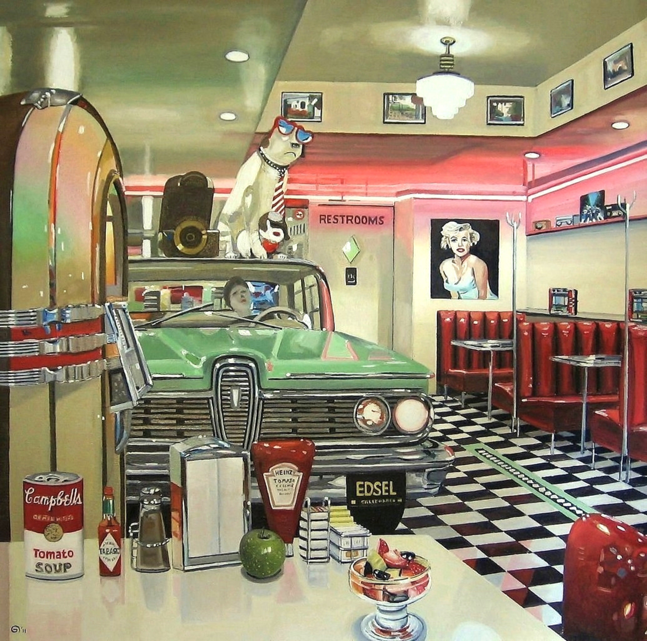 Olieverf op doek 2011 American Diner, Marylin Monroe, Campbells soup, Apple. Ford Edsel 1959, Heinz Ketchup