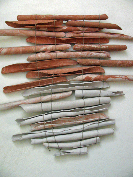 Hangende keramiek. Rollen gebakken en gekleurde klei en touw.