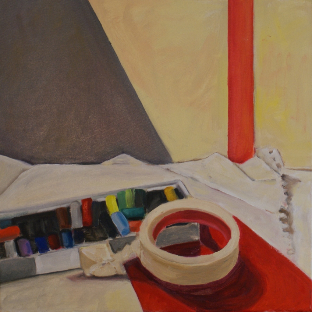 Stilleven van tekenmaterialen. Een onderwerp die tekenaars wel aan zal spreken.Voor de achtergrond is een ander schilderij van mij zelf gebruikt. Het geheel is kleurig en de compositie is speels.