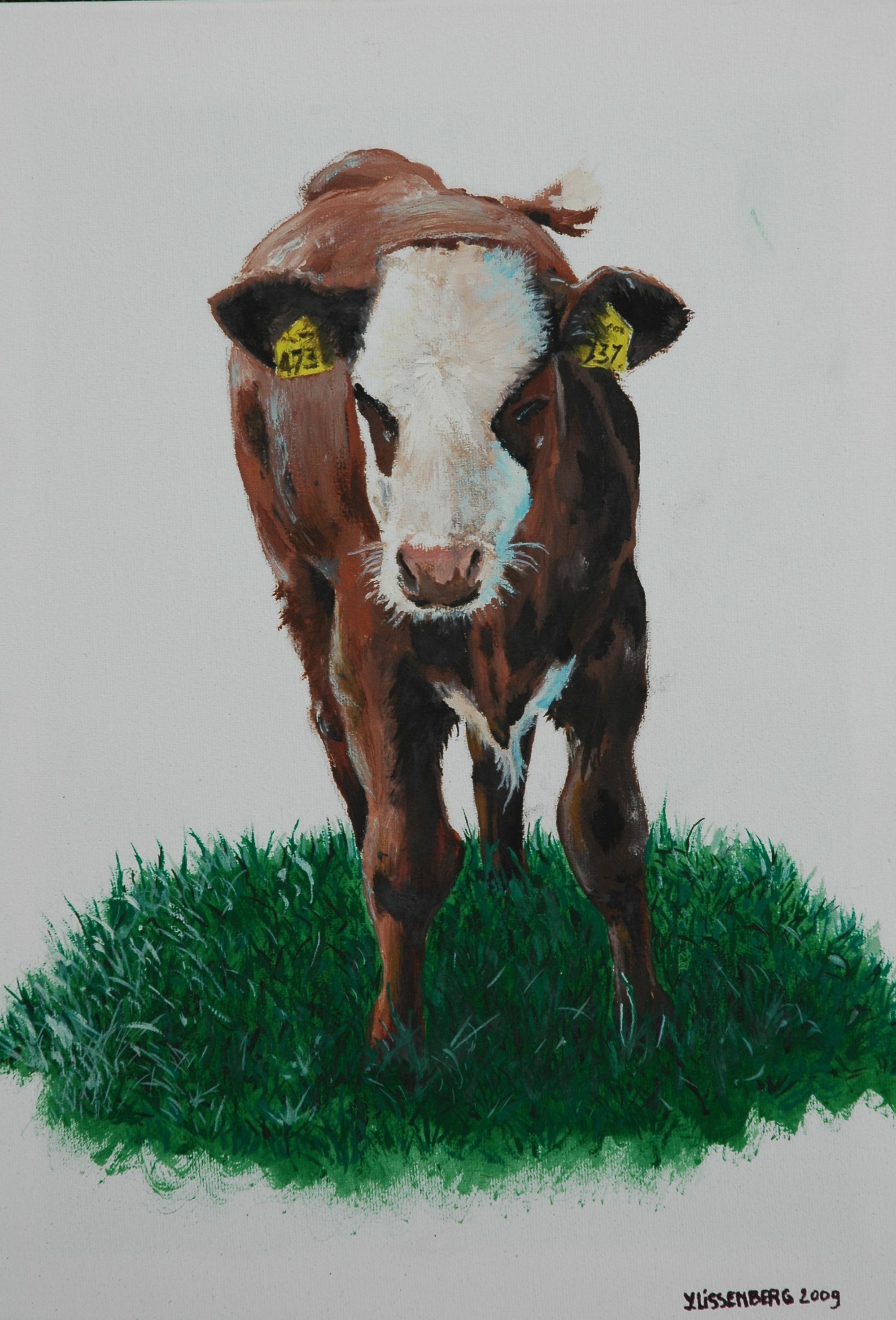 Rood Stier Koe Realistisch Olieverf Gras Kalf Blaarkop