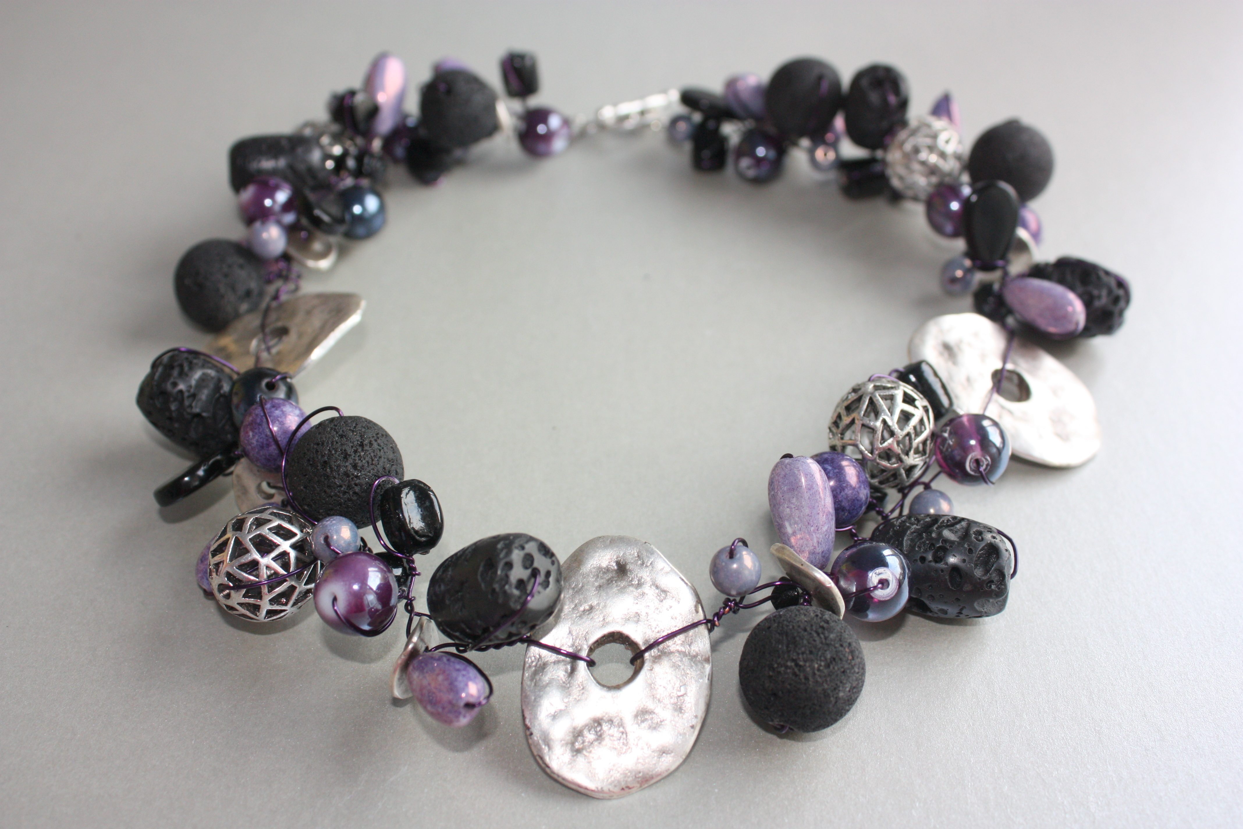 Geknoopte ketting met lavastenen,paarse en zwarte glaskralen,metalen bollen en schijven uit Bali ingekocht