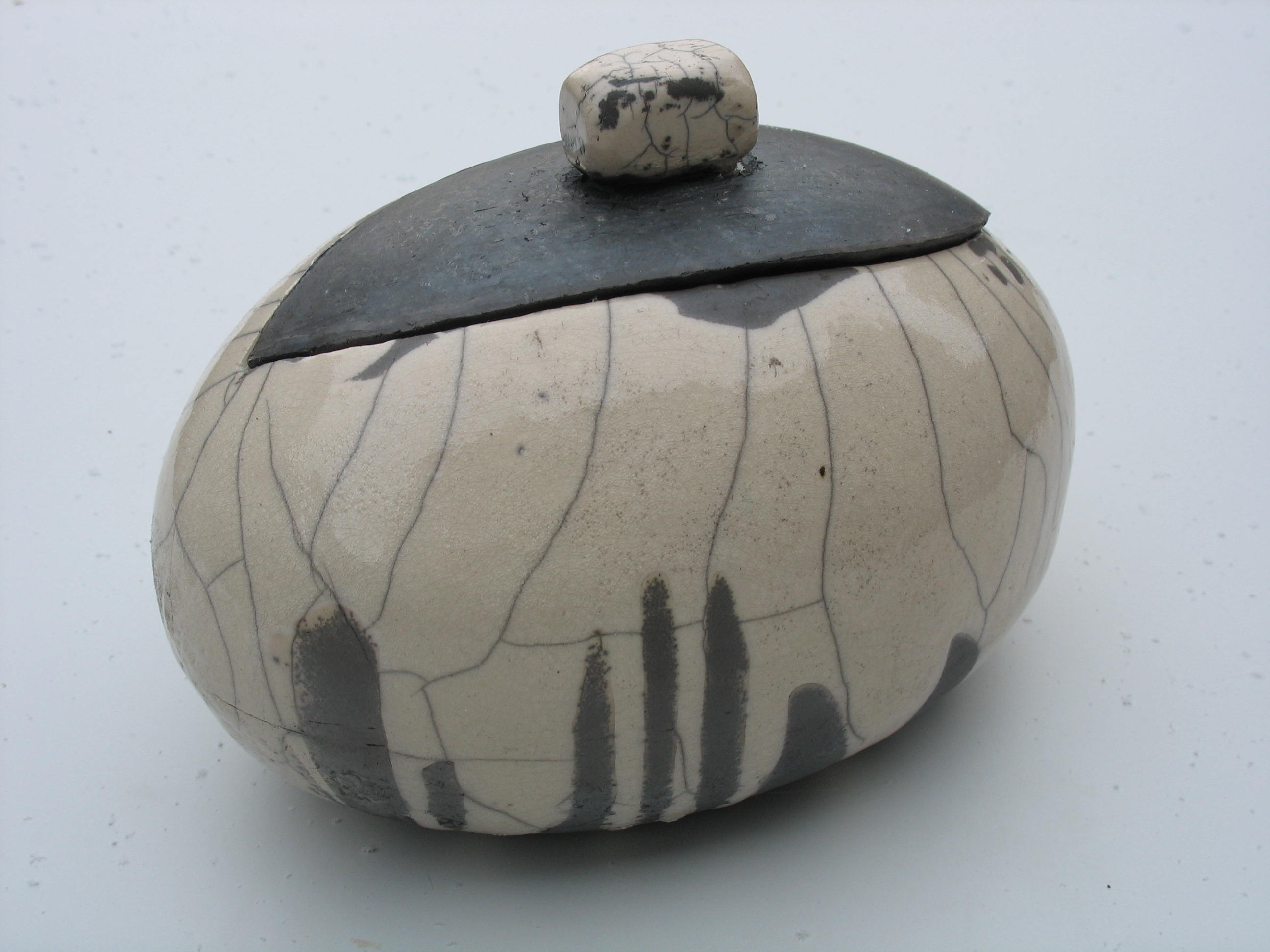 Raku gestookte ovale vaas met deksel