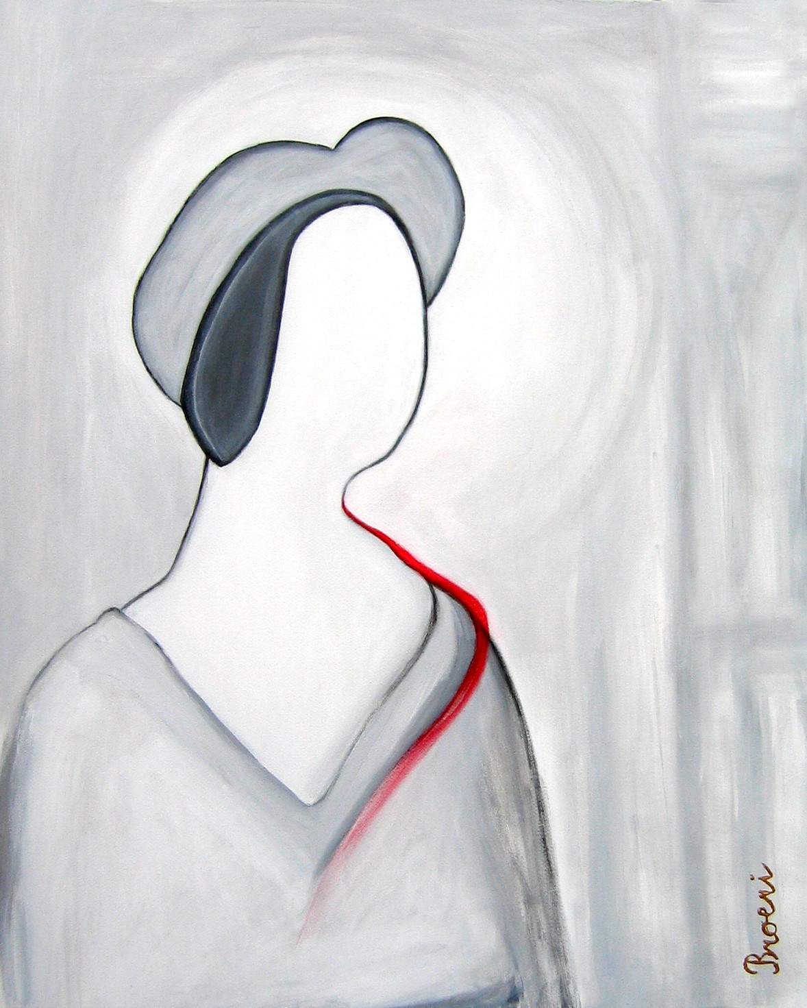 Abstraherend figuratief werk, waarbij de kleuren teruggebracht zijn naar zwart en wit met een vlegje rood.