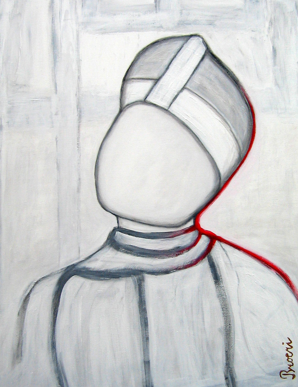 Abstraherend figuratief werk, waarbij de kleuren teruggebracht zijn naar zwart en wit met een vleugje rood.