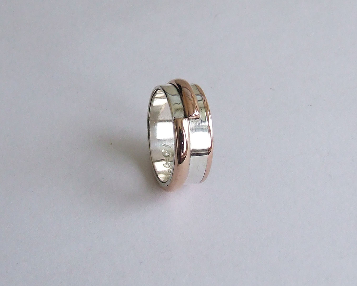 Zilveren (925) ring waarop een bestaande roodgouden trouwring is aangebracht. Deze is in tweeën gedeeld en versprongen gemonteerd. Het sieraad is hoogglans gepolijst. (ontwerpopdracht S1121)