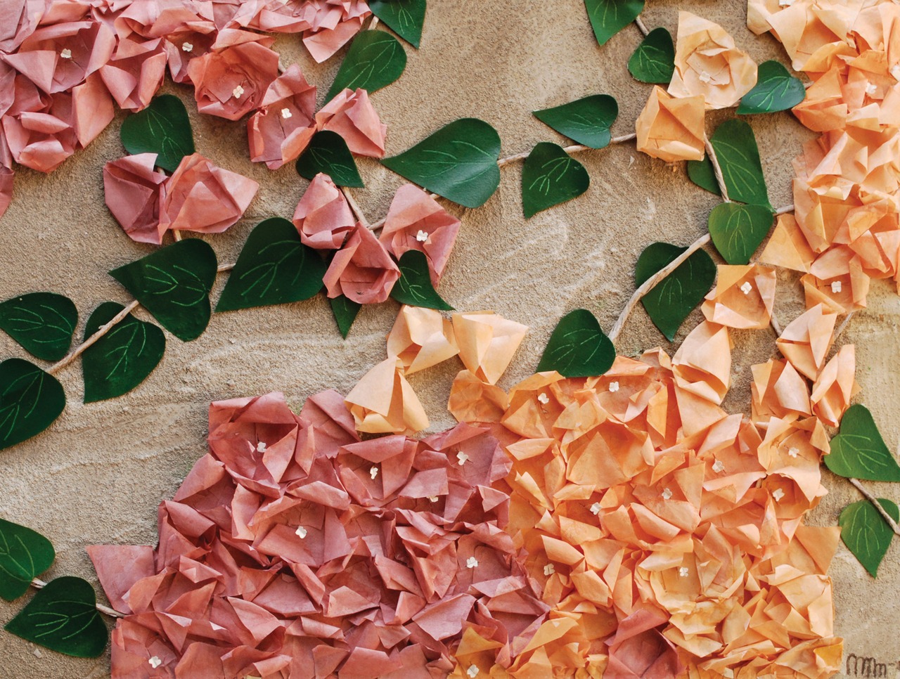 De blaadjes van de bloemen zijn stuk voor stuk geknipt en gevouwen van vloeipapier om een 3 - dimensionaal effect te geven.