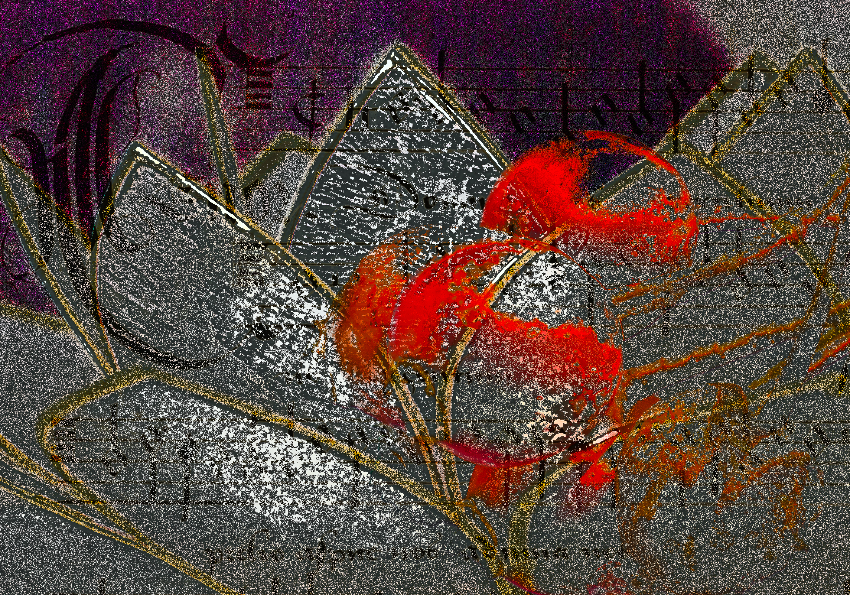 Digitale collage van een foto van een lotuslichtje, gecombineerd met een foto van een bladzijde uit de Leidse Koorboeken en een foto van rozebottels. Op www.jaapderaatphoto.com zijn de bronfoto's te zien. Beetje symbolische verbinding tussen licht uit het oosten, historie van Leiden en natuur.