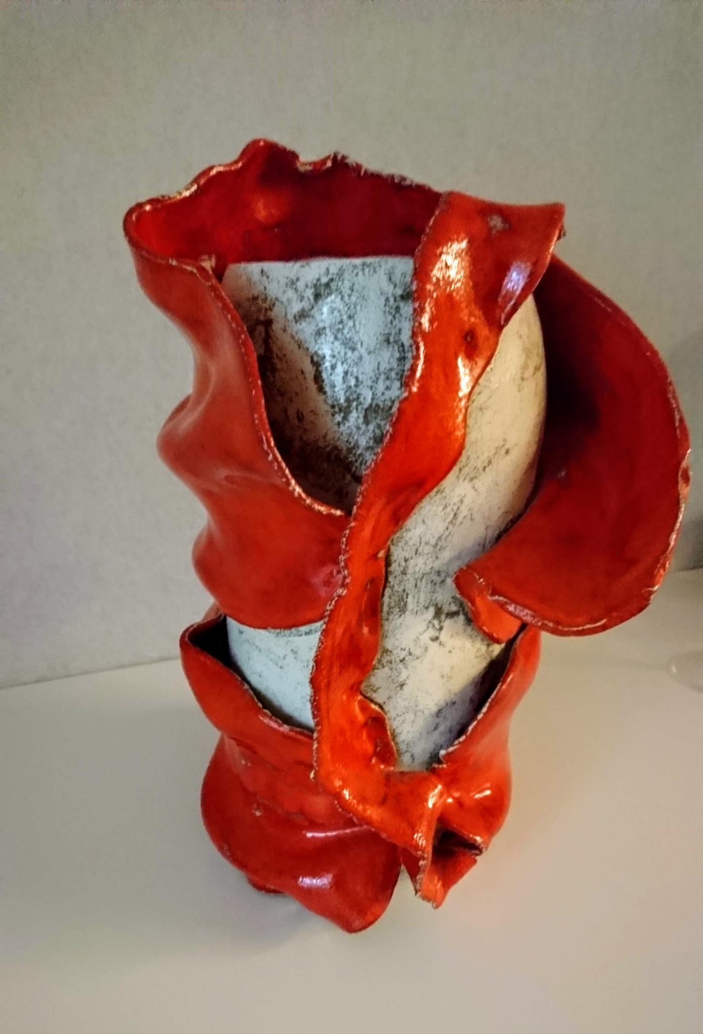 Wit gespikkelde vaas met oranje rode (klei) shawl omwikkeld