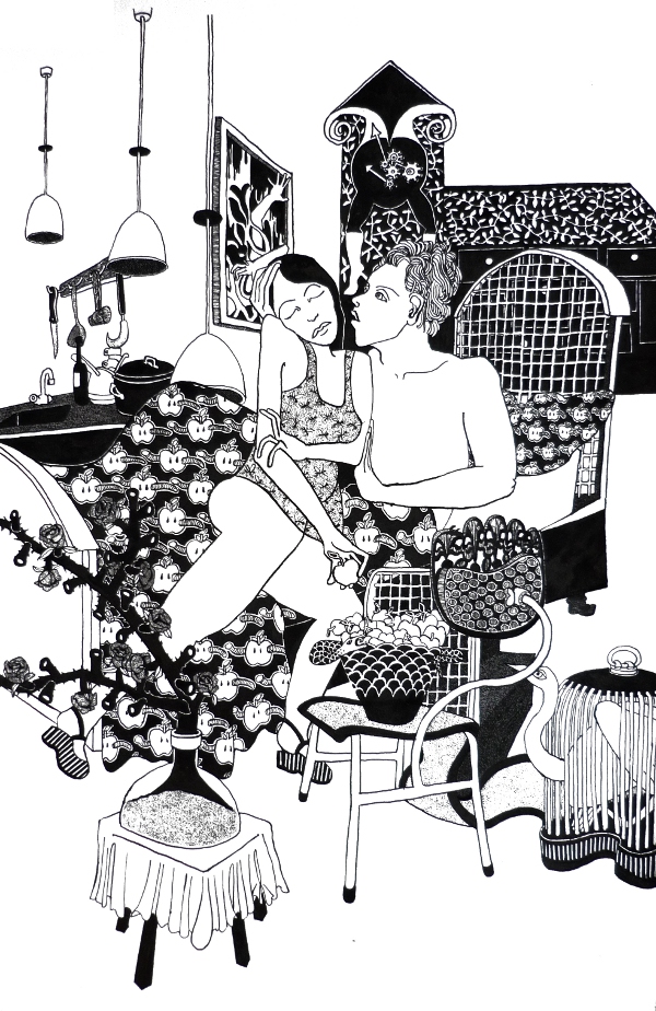 Ellen werkt met pen en inkt en tekent intieme, huislijke taferelen, die bij nader beschouwing vaak surrealistisch van aard zijn en toch óh zo herkenbaar. Haar tekeningen ontstaan geheel op intuïtieve wijze meteen in inkt op het papier, zonder plan of schets vooraf.