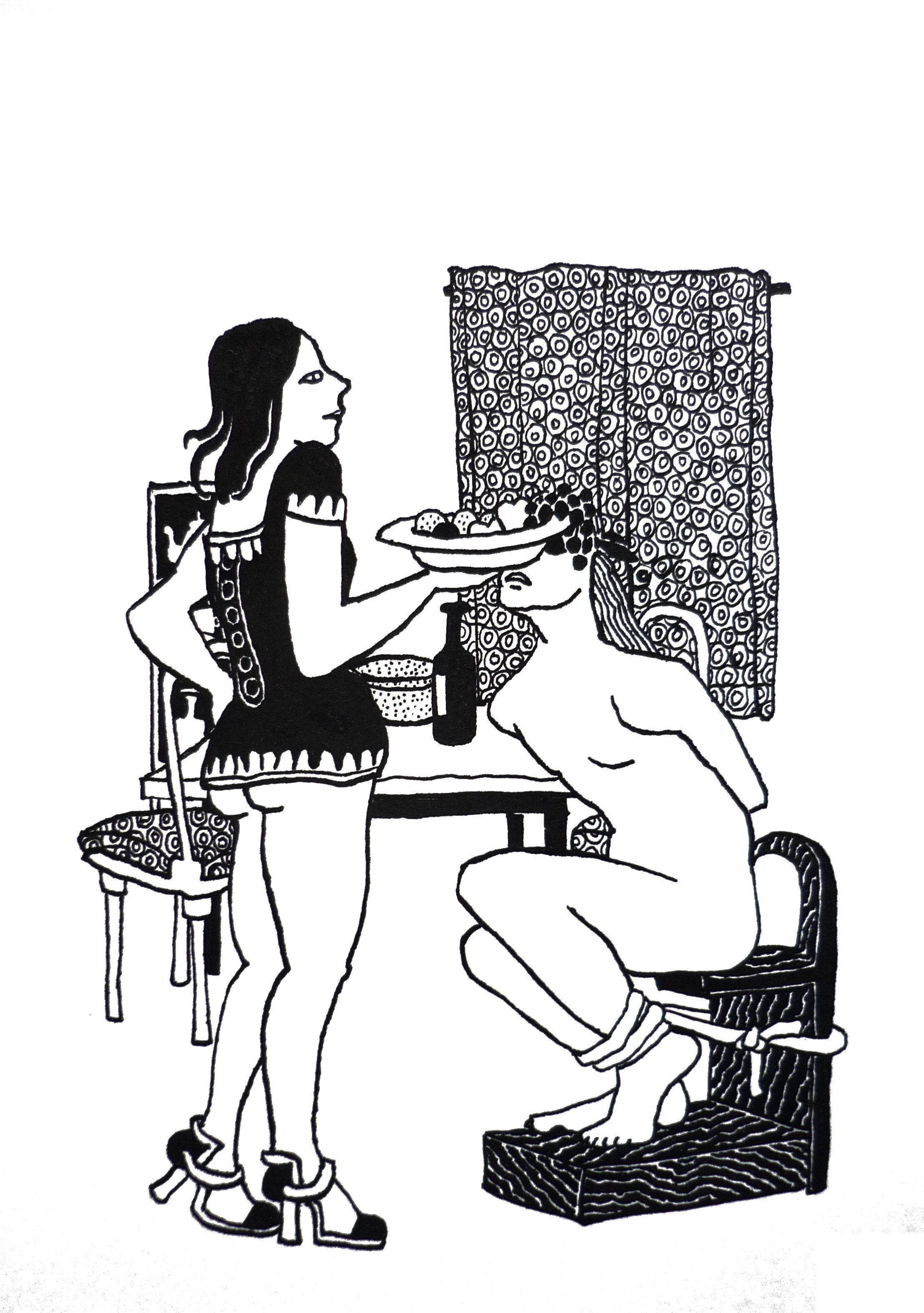Ellen werkt met pen en inkt en tekent intieme, huislijke taferelen, die bij nader beschouwing vaak surrealistisch van aard zijn en toch óh zo herkenbaar. Haar tekeningen ontstaan geheel op intuïtieve wijze meteen in inkt op het papier, zonder plan of schets vooraf.