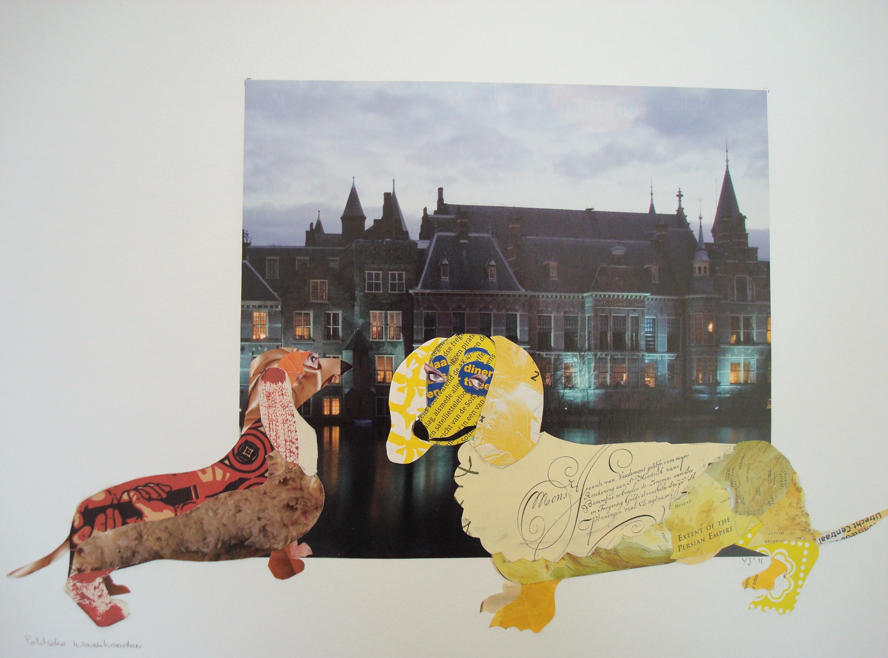 Politieke waakhonden. Collage, verschillende papiersoorten.