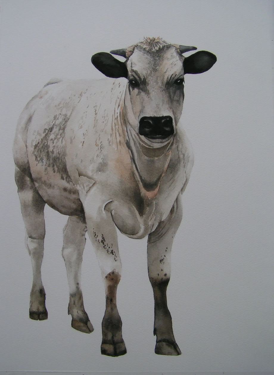 Een jonge, fiere koe van het weinig in Nederland voorkomende ras British White. Een lichtgekleurde koe met zwarte oren en een zwarte snuit. Soms ook wat warte vlekken.