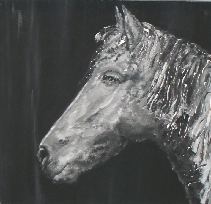 Paardehoofd geschilderd met muurverf op hardboard