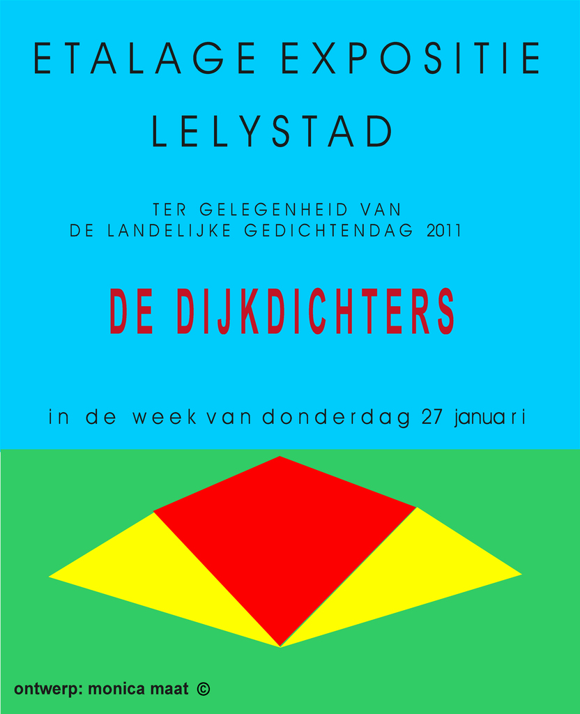 GRAFISCHE VORMGEVING POSTER: Monica Maat. In het kader van de Landelijke Gedichtendag 2011, hebben De Dijkdichters - een Flevolandse Dichterskring - een Etalage Expostie georganiseerd. Monica ontwierp deze Poster. Gezien de reacties, refereert de poster aan de Flevopolder. 14 dichters - waaronder monica als beeldend kunstenaaar met 12 gedichten bij kleine afbeeldingen van haar computerontwerpen - waren in de etalages van maar liefst 130 winkeliers in Lelystad te zien en te lezen. [Zie ook de link op deze site naar de Dijkdichters onder de rubriek: interessante links] +++ Een dergelijk ontwerp voor een poster kan in opdracht gemaakt worden. U kunt een prijsindicatie aanvragen voor een print maar ook voor een drukwerkontwerp dat als kunstwerk [affichekunst] op plexiglas of geschuimd pvc gebruikt kan worden.