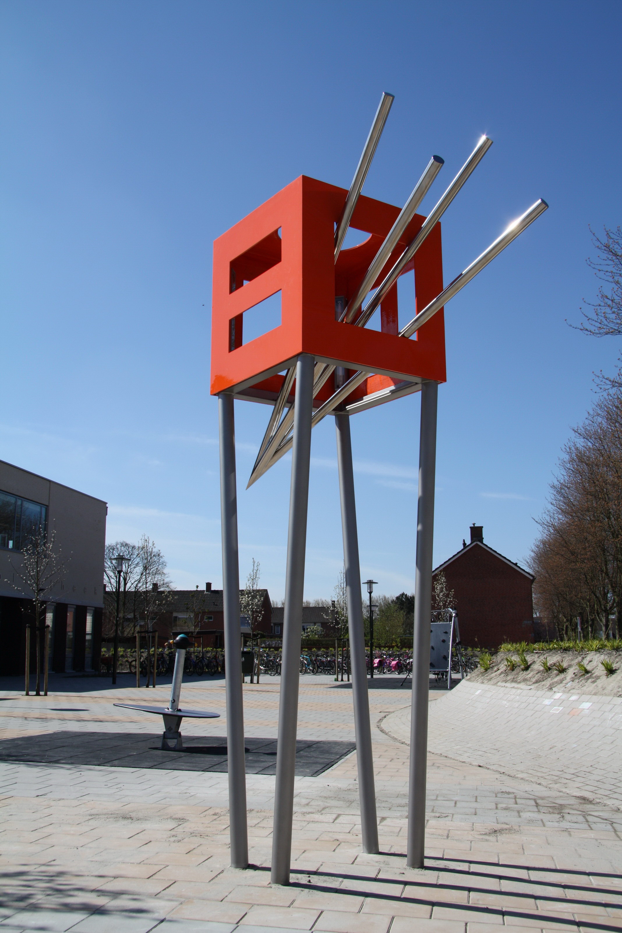 Kunstopdracht van de Gemeente Tholen voor de Brede School in St. Annaland. In de oranjekleurige kubus van 0.95 x 0.95 x 0.95 m. zijn de gepolijste buizen met een lengte van 2.50 m. schuin geplaatst. De kubus staat op ’geparelstraalde’ RVS buizen met een hoogte 2.50 m. Doordat de staande buizen schuin zijn geplaatst‚ lijken ze‚ als men er omheen loopt‚ ’getordeerd’ te zijn. De kubussen zijn afgewerkt met een gelcoat en gelakt met een tweecomponenten DD lak. De kleuren oranje en blauw zijn o.a. complementaire kleuren. zie ook fil op You tube: jan kettelerij: http://www.youtube.com/watch?v=5Q2kQs-V9yY&feature=player_detailpage