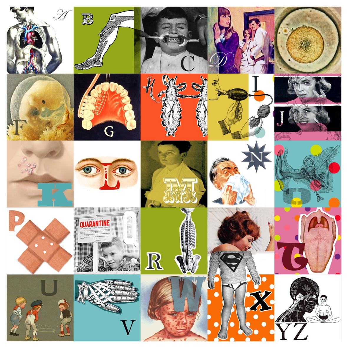 25 doekjes van 20 x 20 cm die een alfabet tonen met medische onderwerpen. Gemaakt voor de etalage van apotheek 'de Vries' in Hengelo