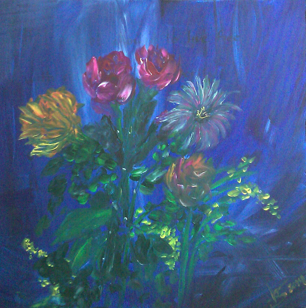 Een snel boeketje bloemen, nat in nat in acryl, fantasiecompositie.