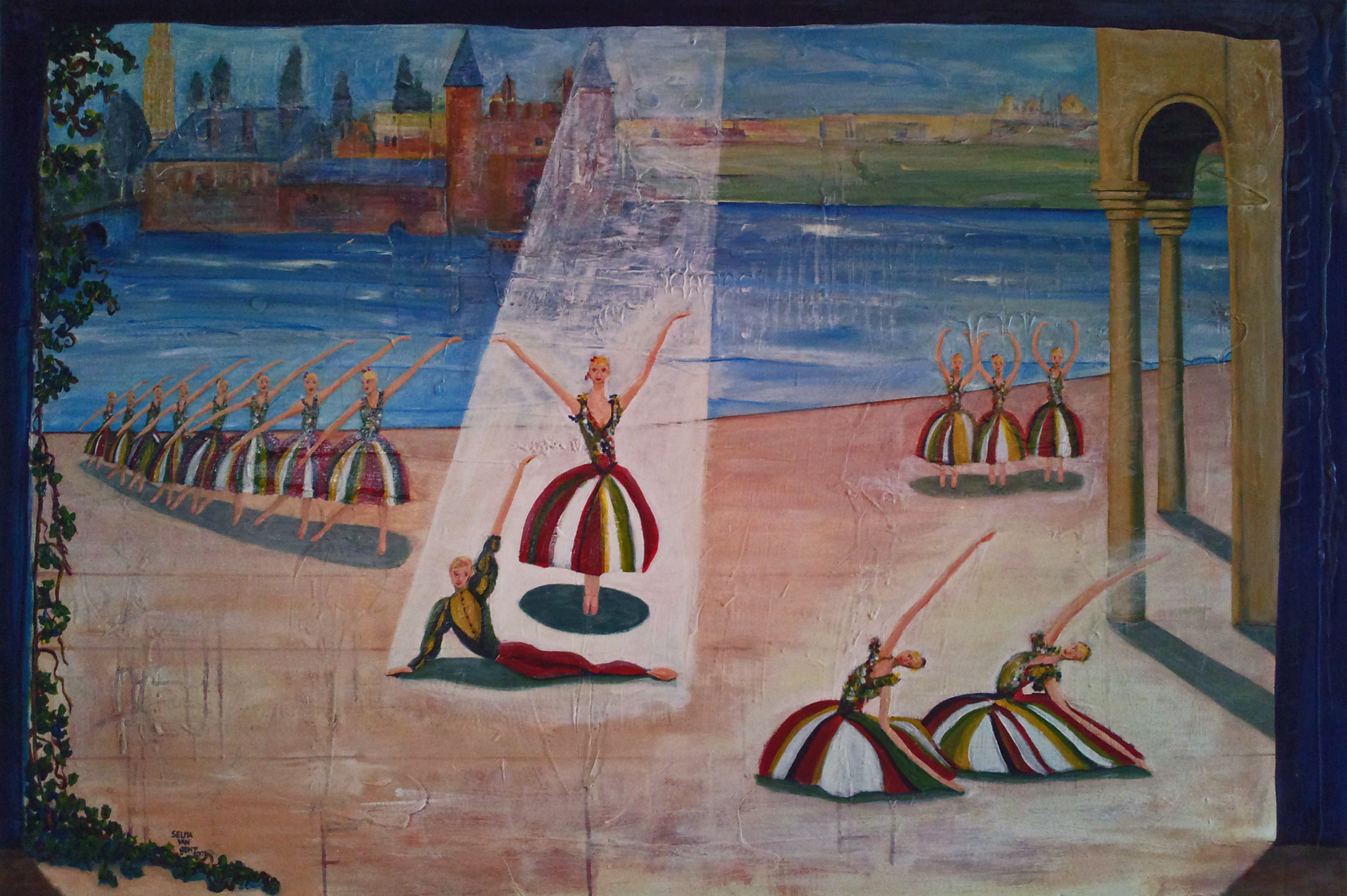 Een groot podium met 14 ballerina's en 1 danser liggend op de grond. Het is duidelijk een decor want je ziet een schaduw onder het achtergronddoek, waar tevens ook een knik in zit. Kleine grapjes en overdrijvingen van mijn herinneringen van het werken bij het Muziektheater te Amsterdam. Jaren lang geniet ik daar al uitvoeringen van het Nationaal ballet.