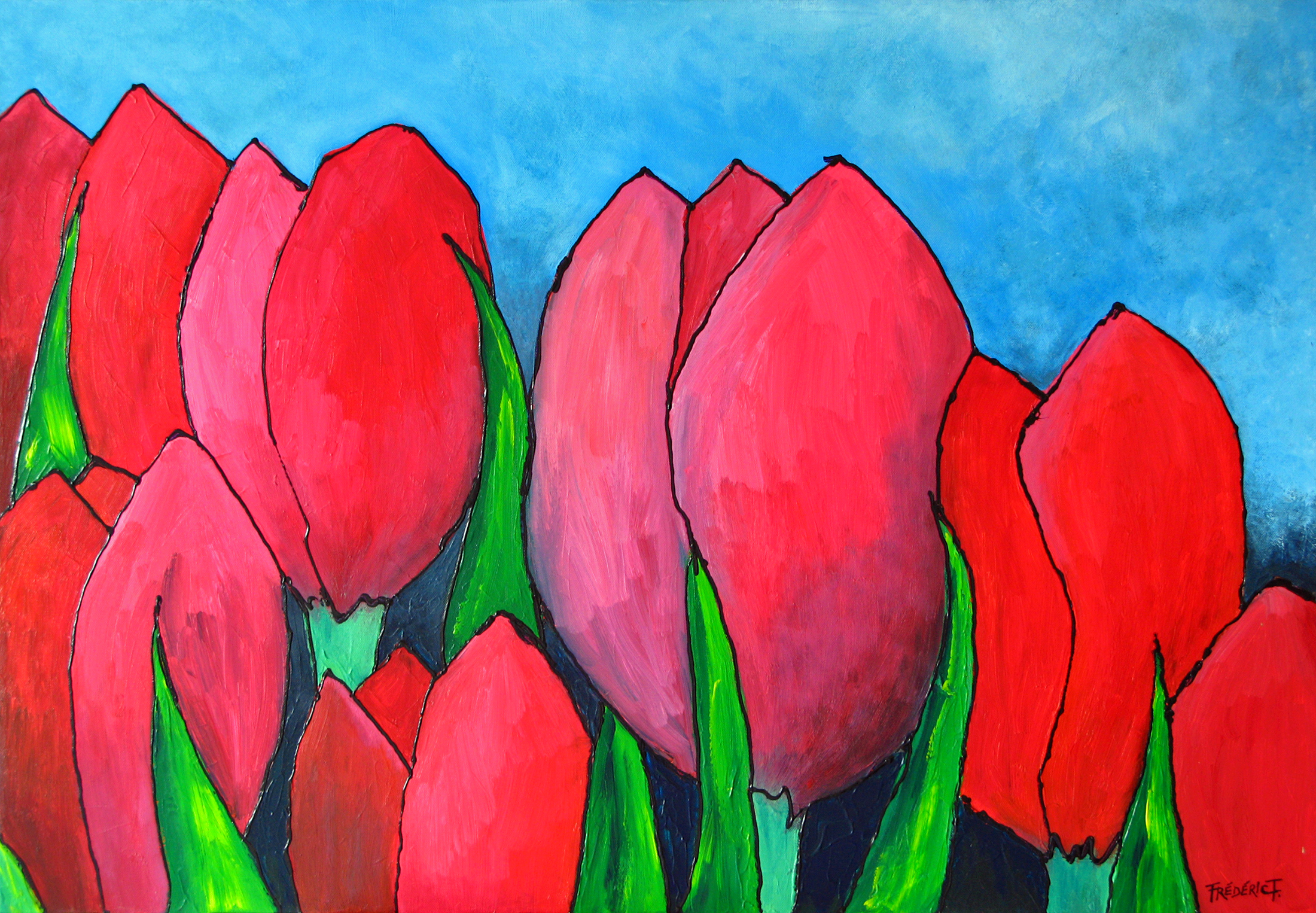 In fel rode tinten deze tulpen in een compacte opstelling geschilderd