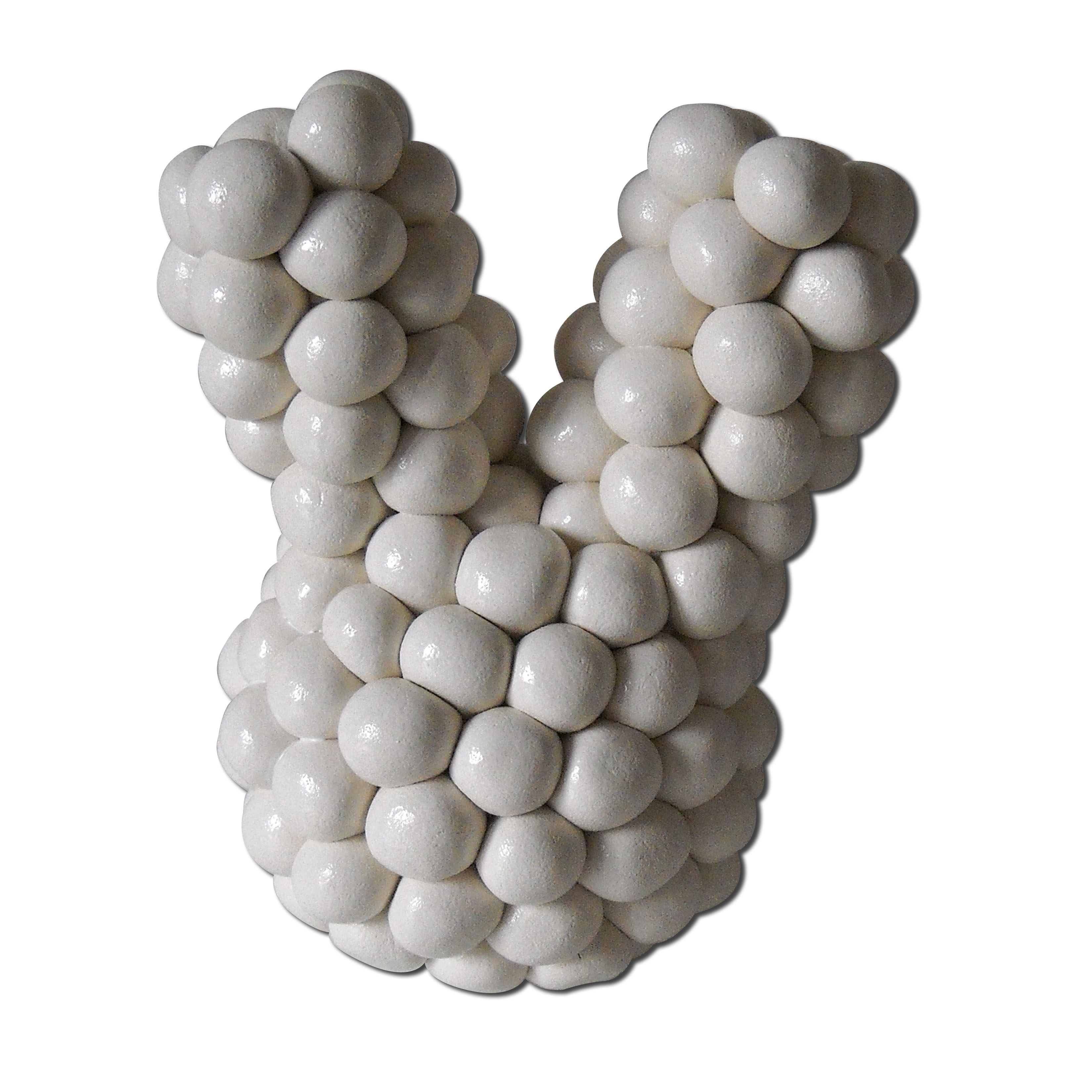 Werkwijze: Handmatig gerolde bolletjes en handmatig samengesteld. Materiaal: Witbakkende fijne chamotte klei. Deklaag: Wit glanzend glazuur.