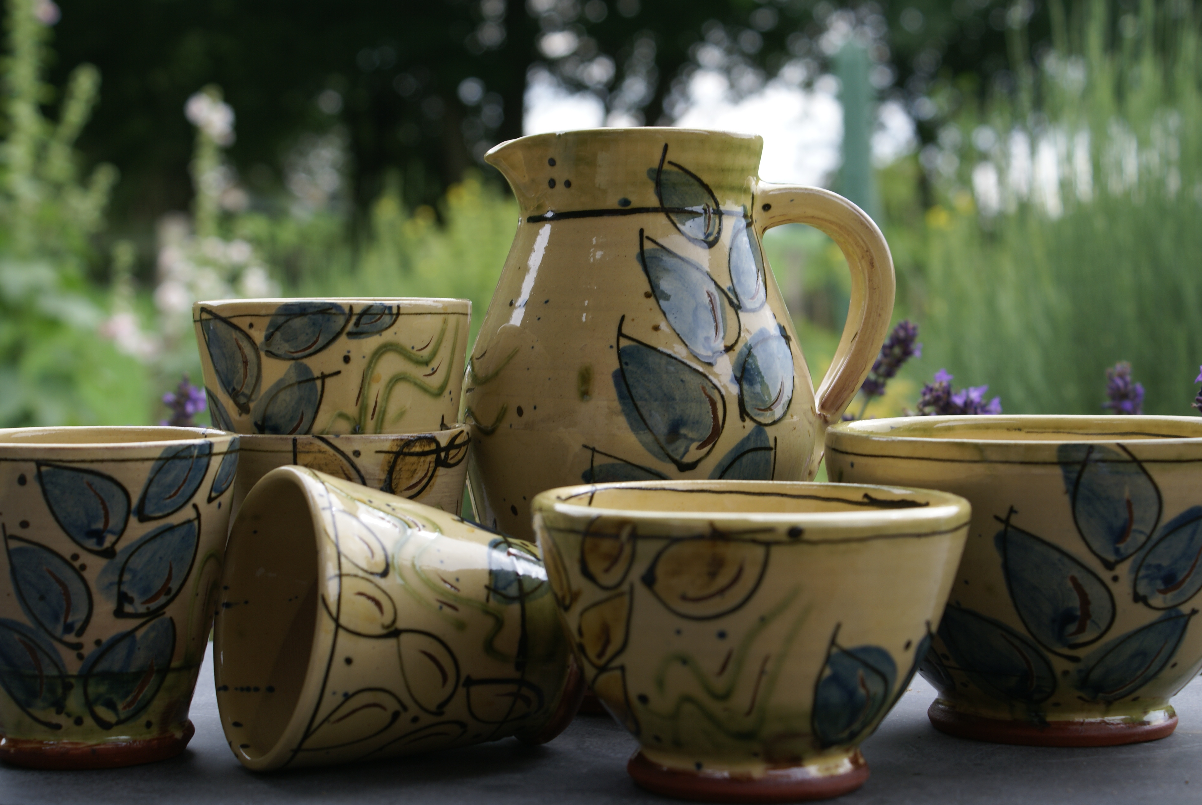 Wijnset Aardewerk Slibdecoratie