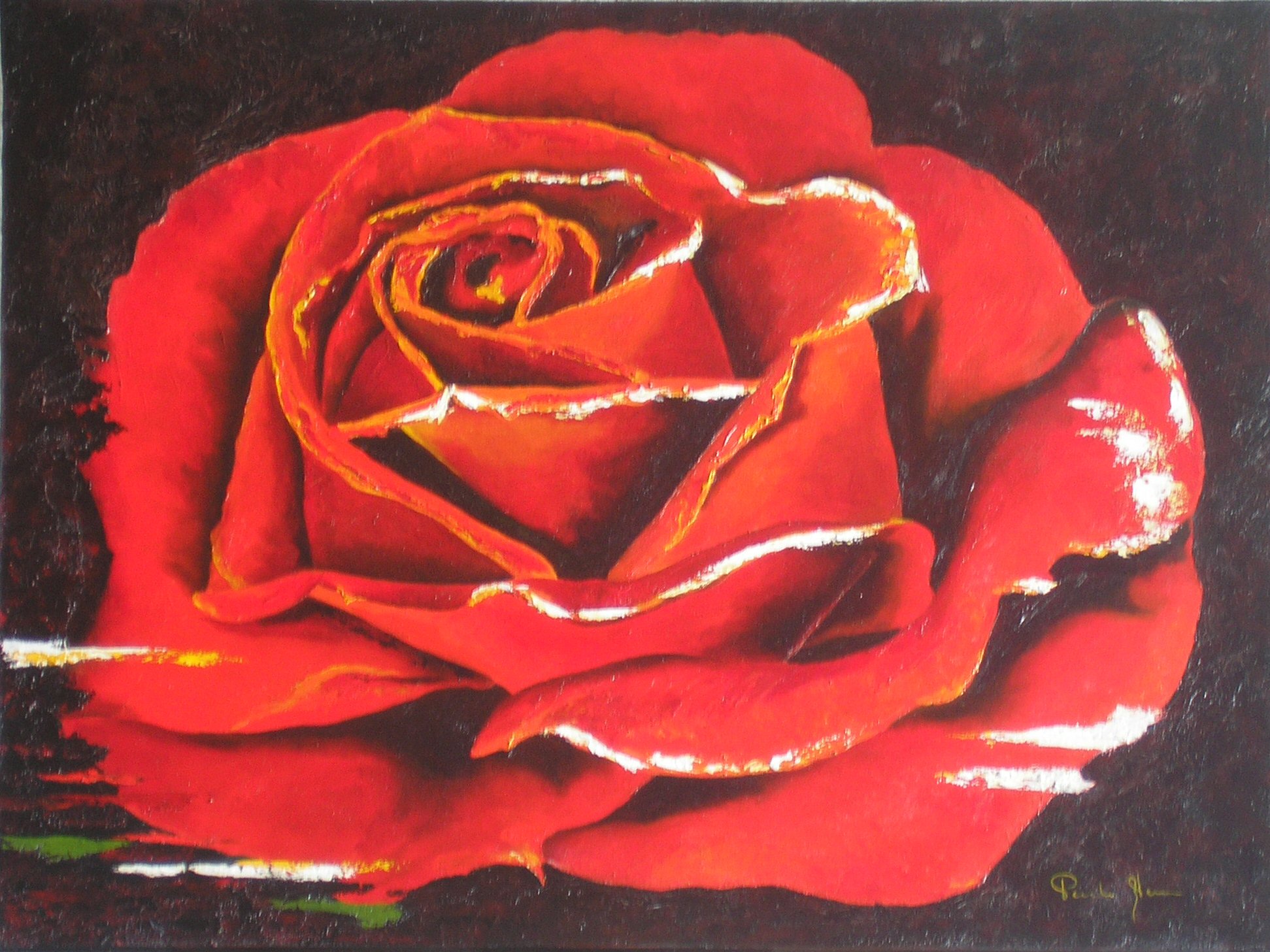 Realistische weergave van een rode roos met zwarte achtergrond, afgewerkt met mes