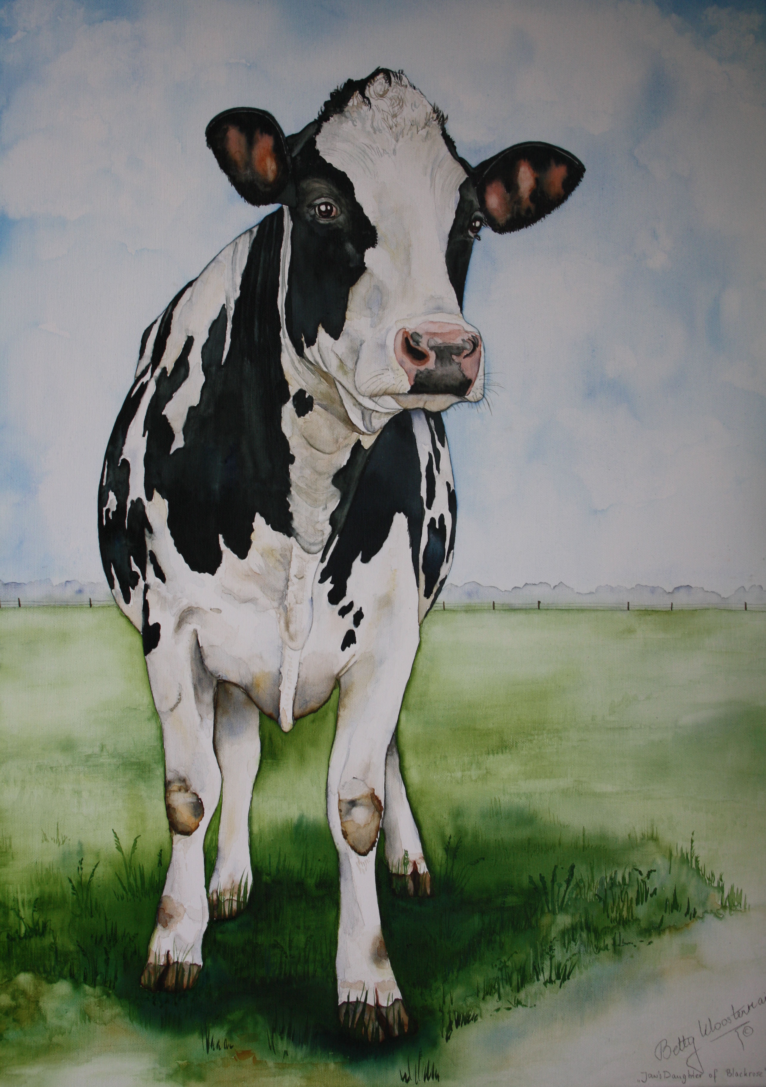Portret van een Holsteiner koe, genaamd Tjep 312. Maar ze is de dochter van Blackrose... Aquarel door een speciale techniek op doek geschilderd.