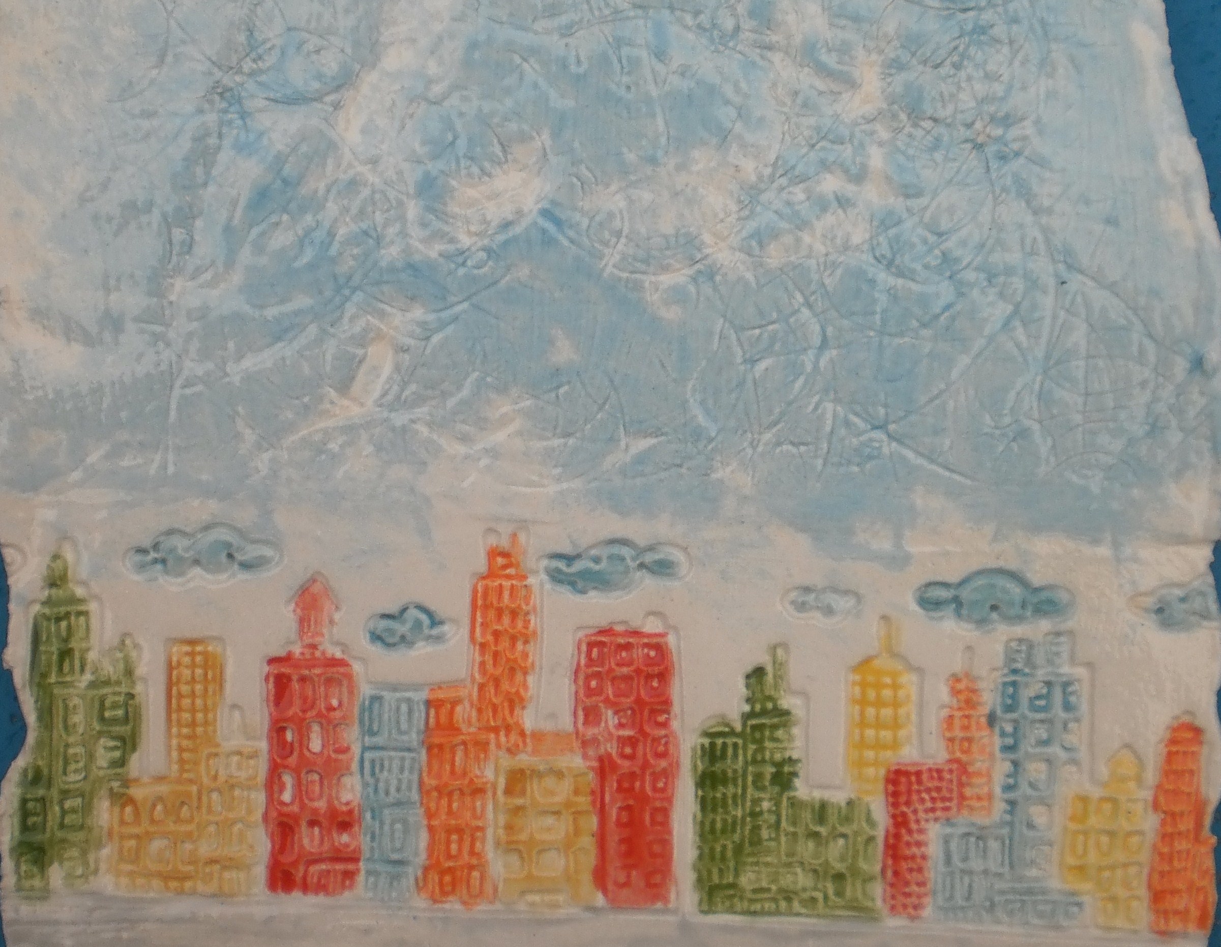 geglazuurd keramiekplaatje met skyline gemonteerd op blauwgekleurde lavasteen