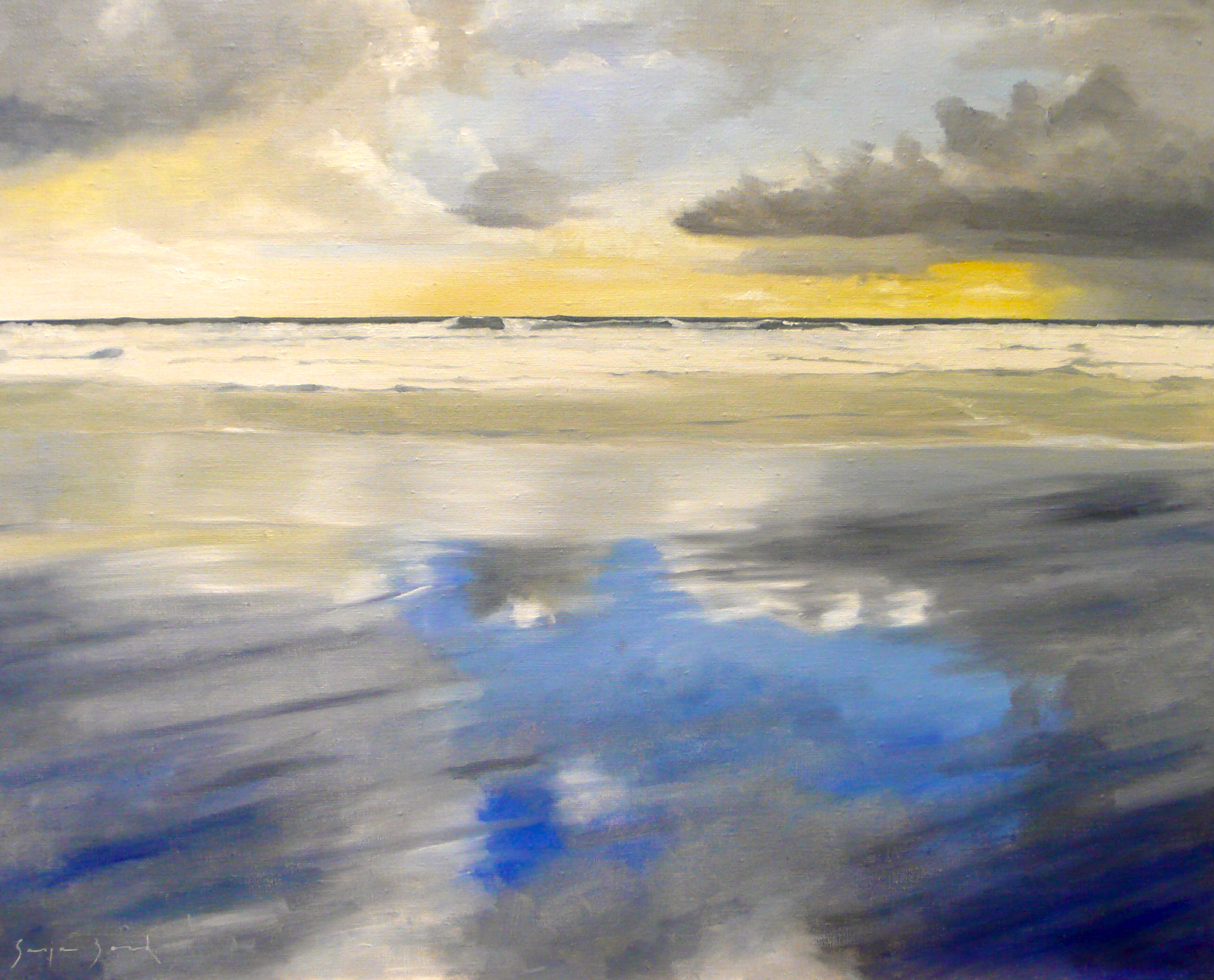 Zee Strand Geel Landschap Blauw Wolken Kleurrijk Realistisch Olieverf Golf Lucht Zeeland Nieuw Golven Luchtspiegeling Raglan