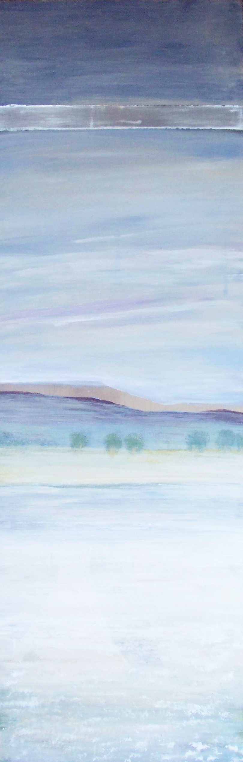 Impressie van een mistig noord-frans landschap met de kenmerkende bomenrijen. Het is op metaal geschilderd, zodat de glans van het metaal invloed heeft op de lichtval over het landschap
