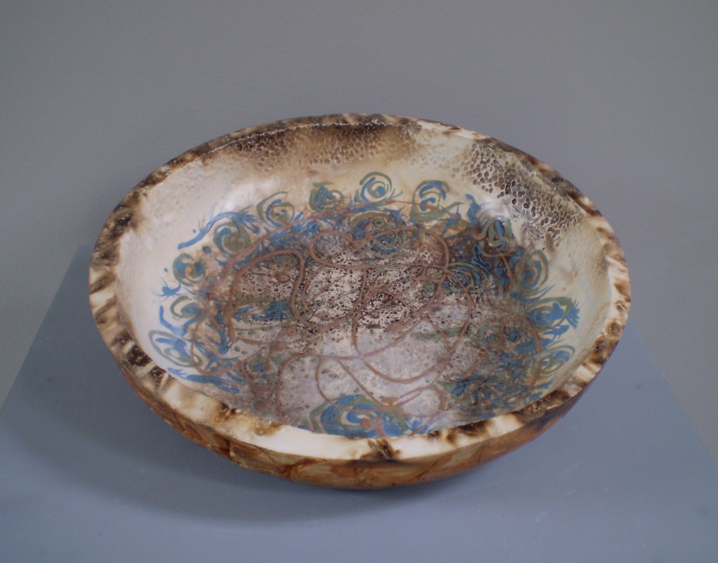 Schaal, handvorm...bewerkt met engobes en glazuren....rookstook.
