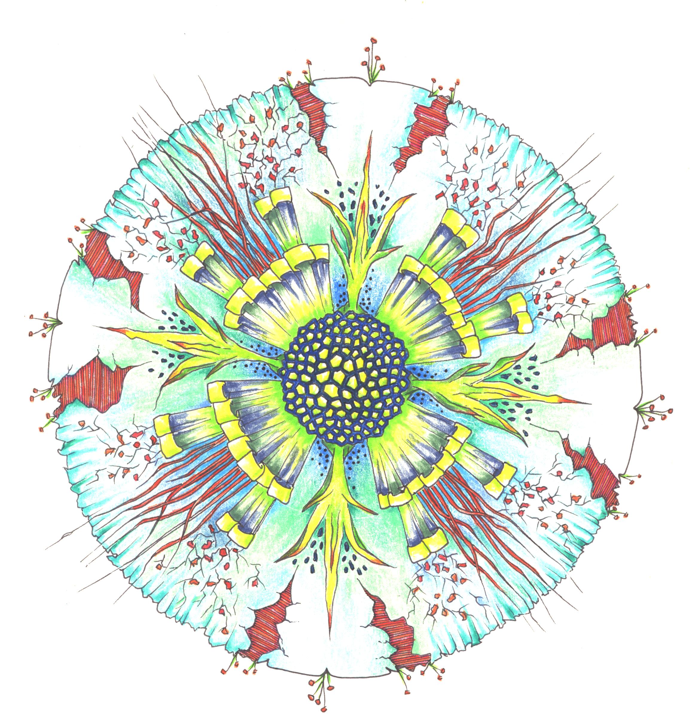 Uit lijnen en kleuren ontstaat een diertje. Het lijkt me een soort kwal, vloeiend bewegend door het water.