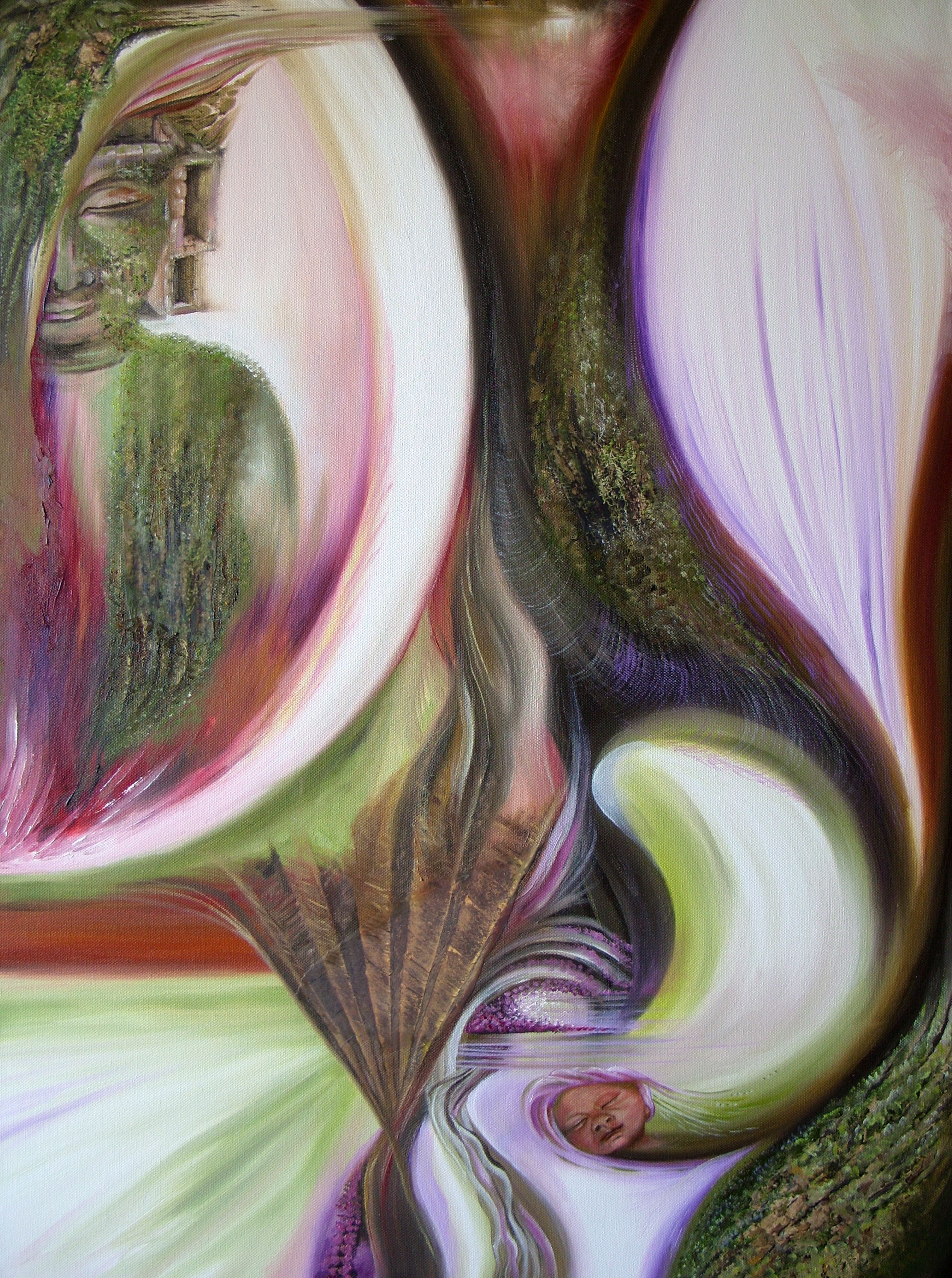 Echo's of time....overgang....geboorte Olieverf met fotoscheursels (1 van tweeluik, samen €1500,-)