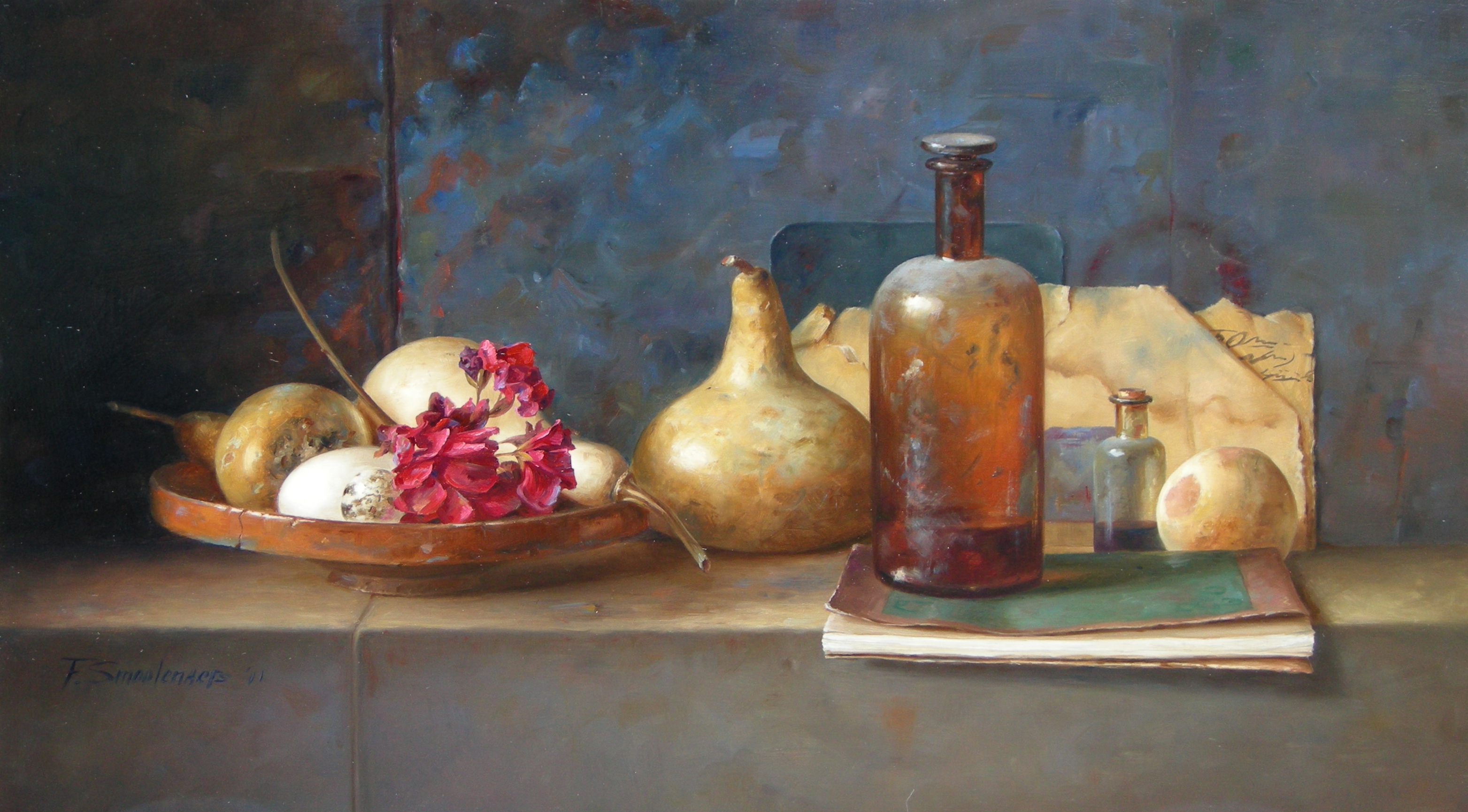 Schilderij Art Papier Olieverf Kunst Painting Stilleven Fles Liggend Kalebassen Flessen Stillife Gedroogd Boekje Fred