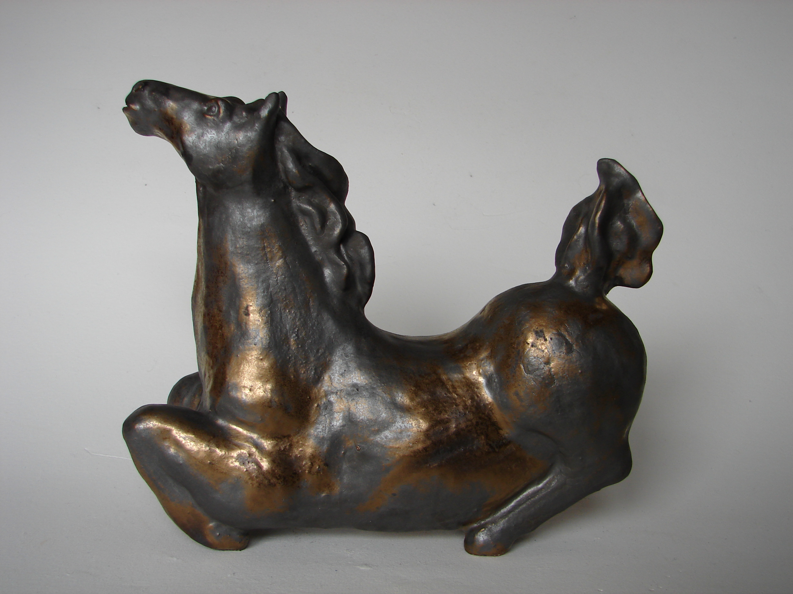 Handgebouwd paardje, geinspireerd op de paarden van Arthur Spronken. Het materiaal is porseleinklei gemengd met steengoedklei. Afgewerkt met een bronsglazuur.