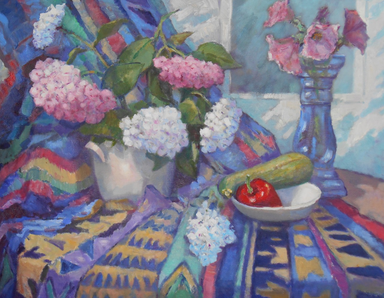 In mijn vakantie wil ik nog wel eens een Stilleven maken. De bloemen in mijn eigen tuin stonden zo mooi, dat ik er een paar geplukt heb eb ze op het doek gezet heb.