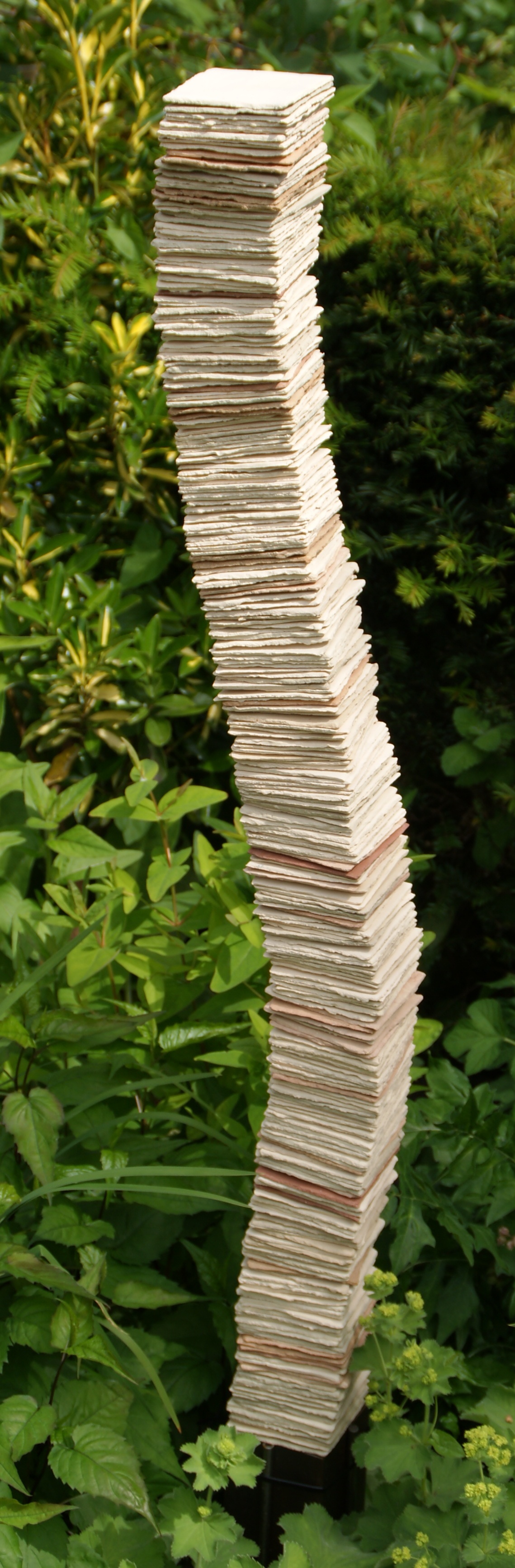 Het leven is een aaneen schakeling van gebeurtenissen, het zijn losse delen van je leven die met elkaar verbonden zijn. Dit wil ik weergeven in een object van keramiek gemaakt met papierklei. Het is gemonteerd op een metalen voet.