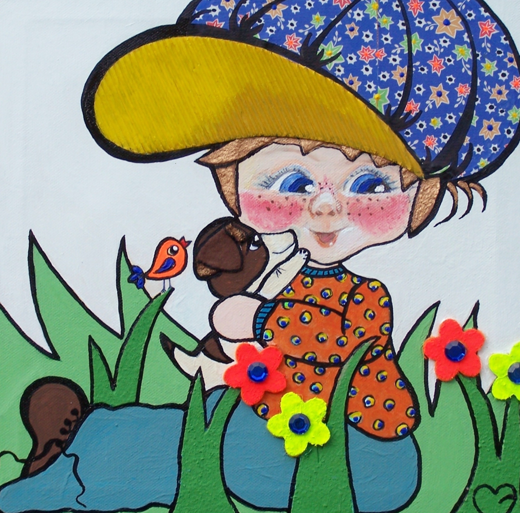 Acryl, inkt, vilt, papier Randen zijn meegeschilderd