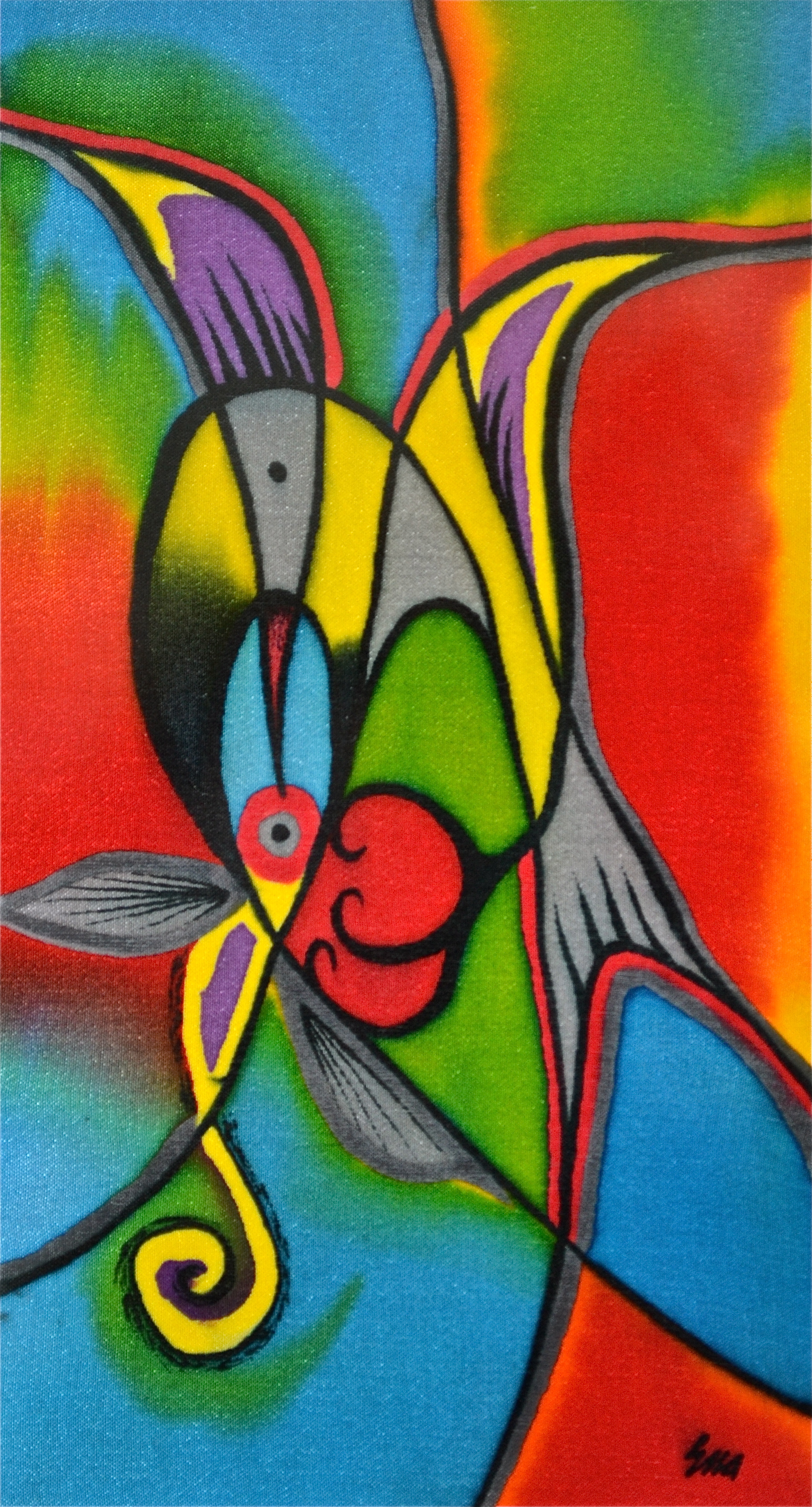 "El Grillo"De bedrieger archetype uit "Over Dromen en Herinneringen". Inkt op zijde schilderij. Dit schilderijtje is ingelijst, passé-(wit) en lijst(wit). Te bezichtigen bij bij Galerie Haamstede, Noordstraat 43, in Burg Haamstede ;Tel. 0111-652580 VERKOCHT.