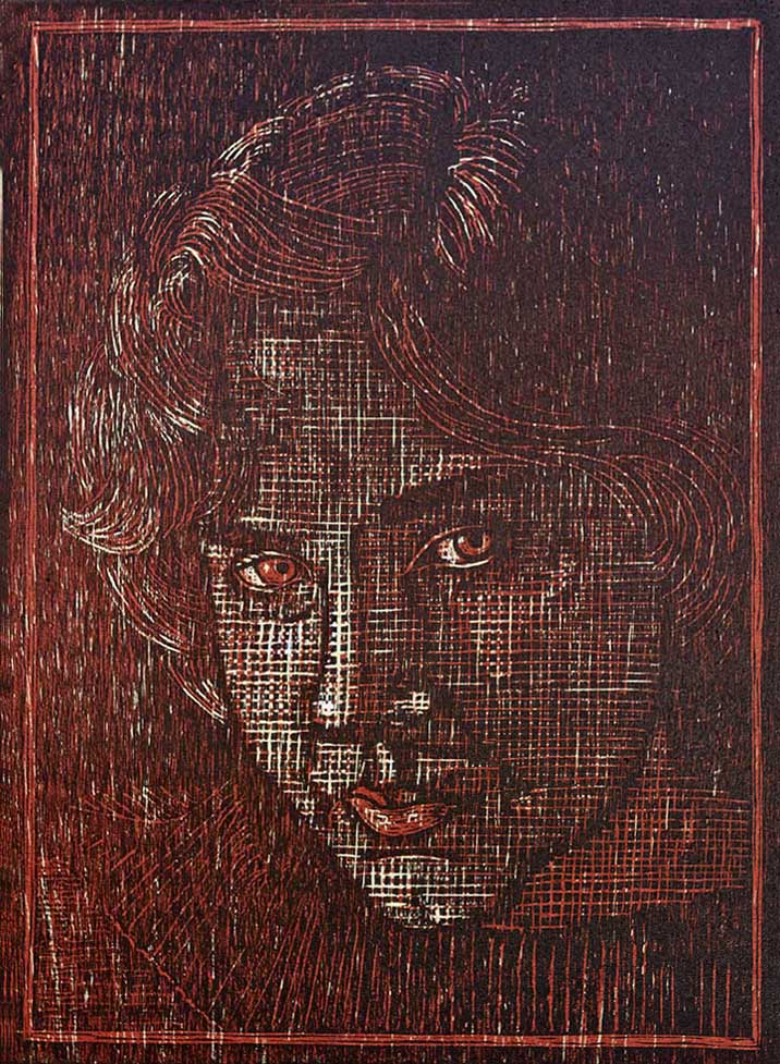 Zelfportret in rood. Houtsnede. Meerkleurendruk van drie blokken