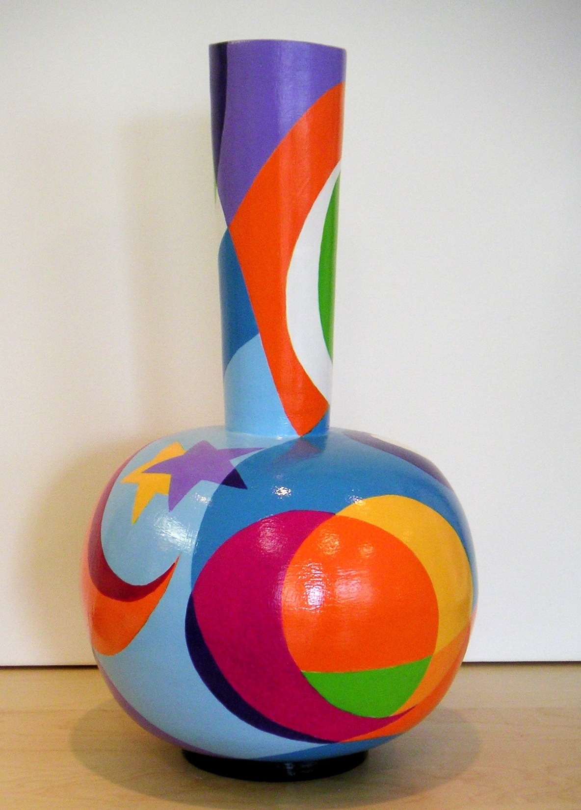 Deze vaas is van bamboe. De buitenkant heb ik bewerkt met milieuvriendelijk kunsthars “Acrylic-one” waardoor de vaas een harde toplaag heeft en nagenoeg onbreekbaar is. Door het schuren van de vele lagen ontstaat er een mooi glad oppervlak. De vaas heb ik beschilderd met acrylverf en afgewerkt met een hoogglansvernis. Het is een kunstobject en niet bedoeld als bloemenvaas.