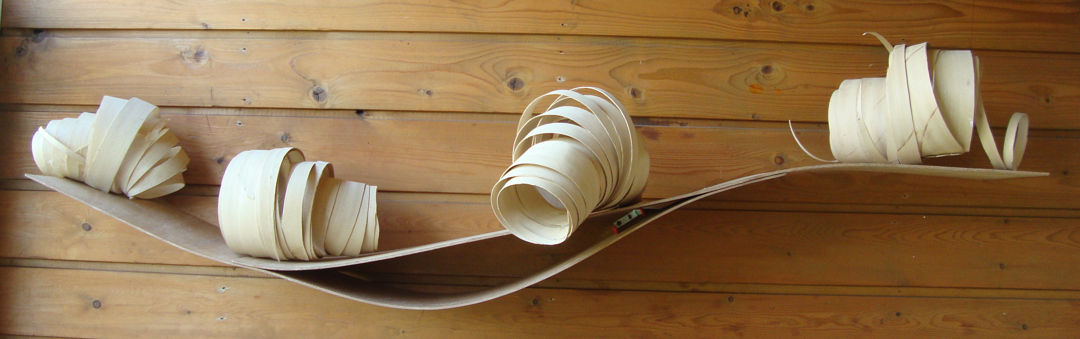 Dit werk is geïnspireerd door cocons. Ze willen zich ontwikkelen, zoeken het hogerop. Het is gemaakt van houtkrullen.